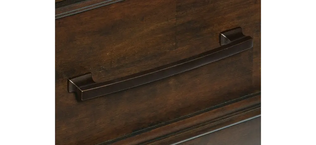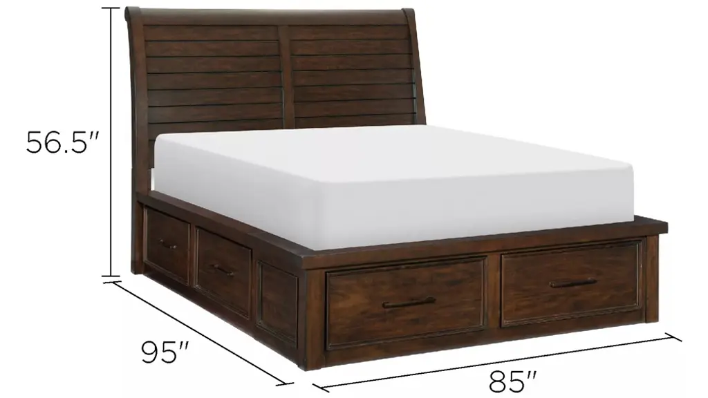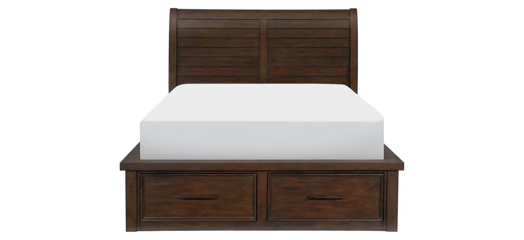 The transitional framing of the Rosemont Bed allows for versatile placement within a number of classic bedroom decors, making a perfect choice for your home. A brown finish is utilized over mango veneer for subtle highlighting of its distinct grain. A total of 6 drawer units are located on the side rails and footboard of the bed creating additional storage space within your bedroom. The sleigh headboard is paired with a platform footboard resulting in an unfettered design. Dark finished pull hardware front each drawer creating a complementing accent to the drawer fronts.