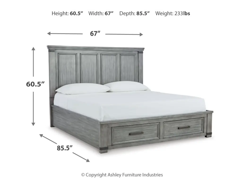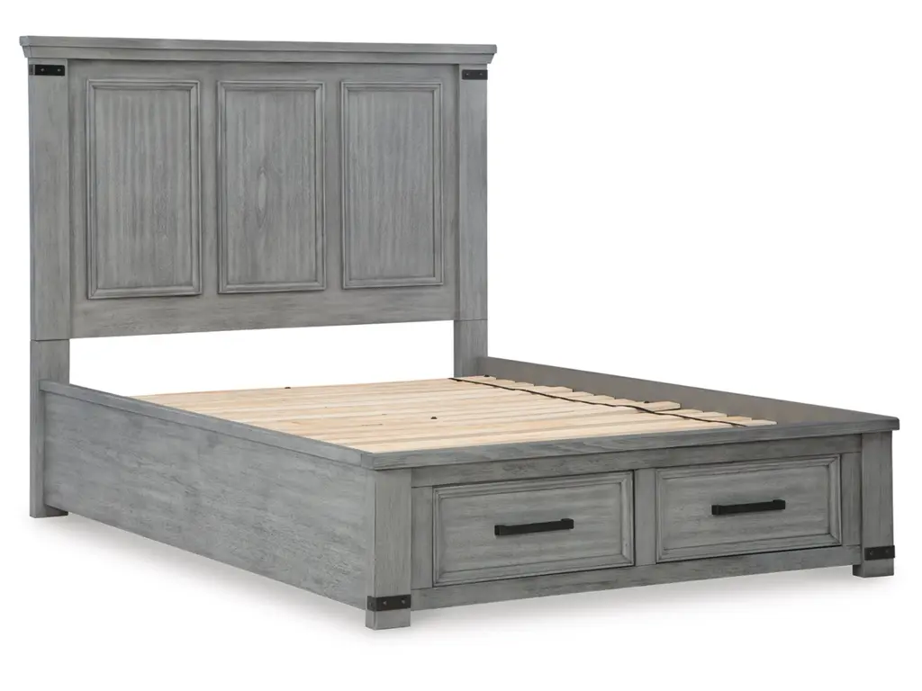 With its light weathered gray coloration, the Russelyn storage bed conveys trend-right urban farmhouse style. Thick-profiled top moulding on the tall, mansion-scale headboard lends a fresh take on a timeless design. The footboard features two storage drawers with profiled frames and dovetail construction. Bar pulls and metal straps in a dark aged bronze tone add to the rustic-yet-refined aesthetic.