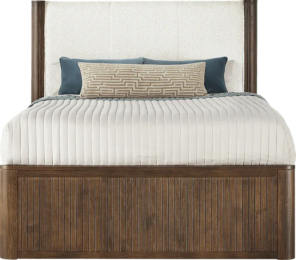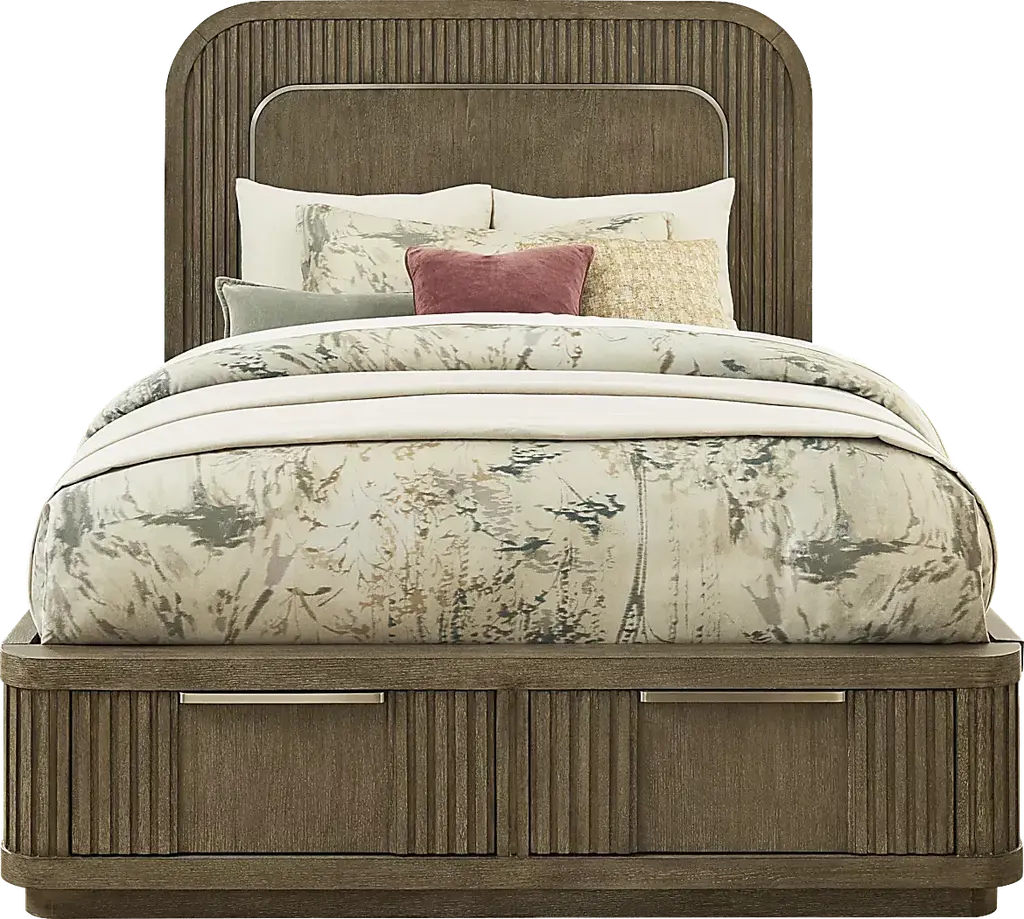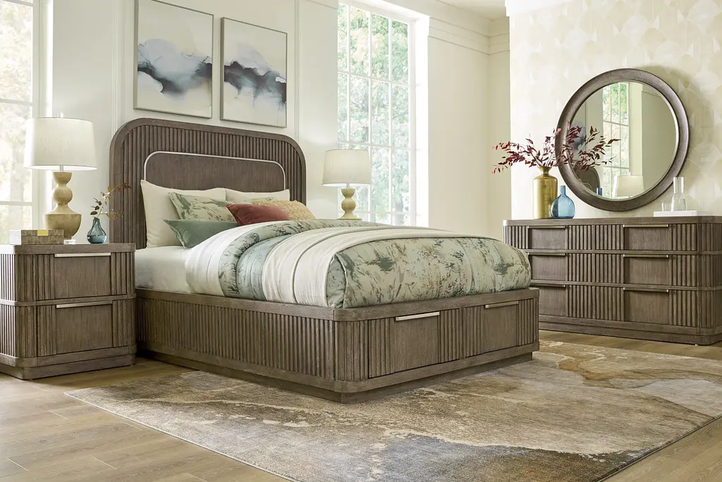 Boldly confident with a gentle touch of softness, the Sausalito bed from Drew & Jonathan punctuates the day with a quiet double-take at its red carpet-worthy looks. A commanding headboard crafted with oak veneers in a brown finish is trimmed with an outer arch of stunning reeded details. The footboard echoes the carved design and stands on a plinth-style foot. Storage drawers at the foot of the bed feature stylish low-profile metal pulls. Mattress and foundation (if required) sold separately.
