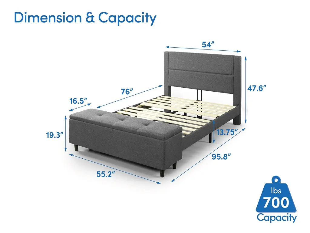 Bring extra convenience into the bedroom with the modern and versatile Platform Bed, complete with an attached storage bench! Built for more than just sleep, the bed gives you cushioned seating room on top of a 19-inch wide storage bin that’s perfect for keeping extra pillows and linens close by. Its sleek, foam-padded headboard lets you relax in comfort, and its reliable wood platform flawlessly supports any mattress without a box spring.Engineered with a steel frame and center support legs, this practical foundation is one you can count on for many years of serious snoozing and unwinding. And talk about clever, all the parts, tools and instructions needed to put it together come expertly packed in the storage bin so you can easily maneuver the shipping box into your bedroom for simple assembly. With a friend’s help and just about an hour of your time, you’ll have a brand new, cozy platform bed with a nifty storage and seating bonus.