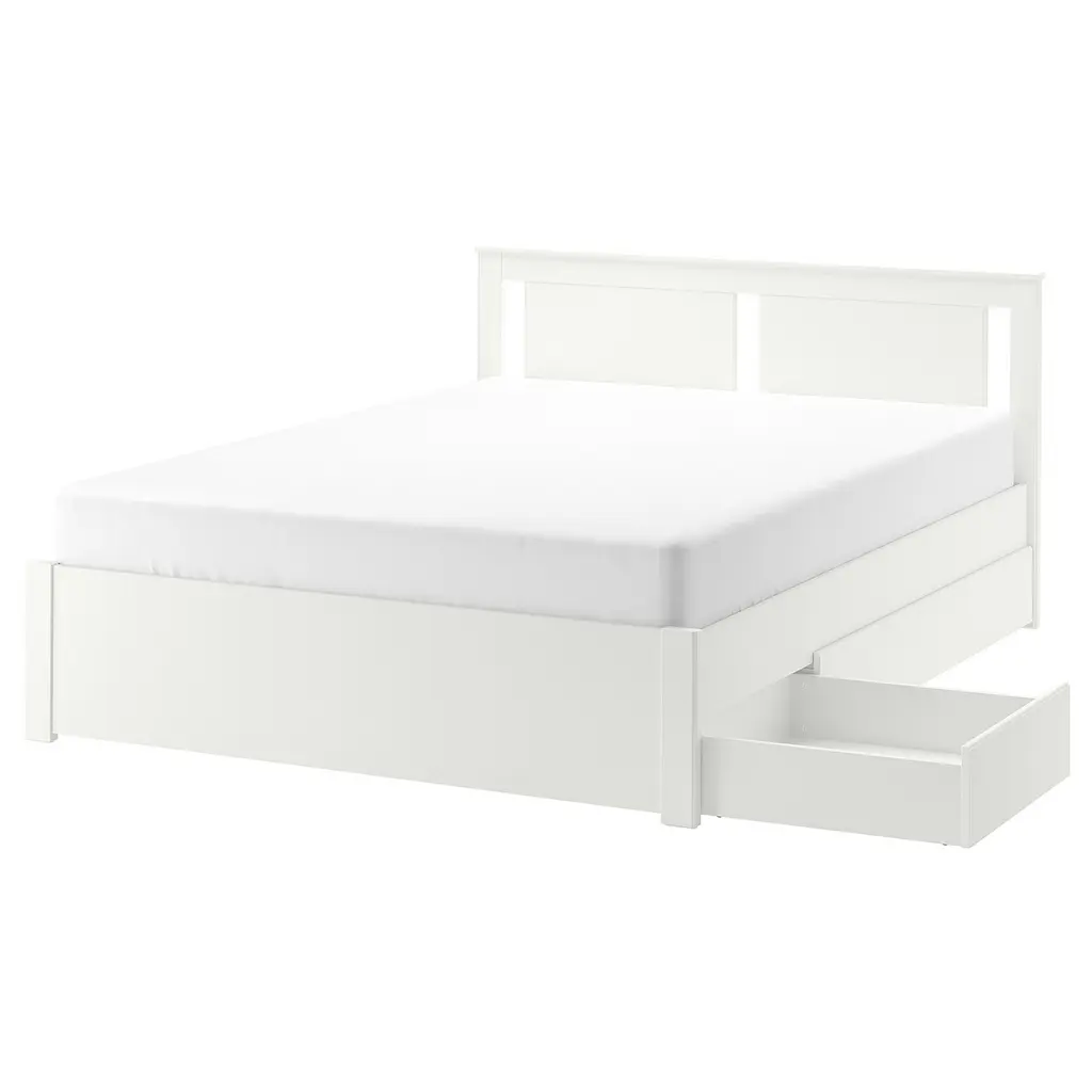 SONGESAND Bed frame with 2 storage boxes - white Queen. This classic bed frame will look great with your choice of textiles and bedroom furniture. You can even complete the look with other products from the SONGESAND series. Adjustable bed sides allow you to use mattresses of different thicknesses.
