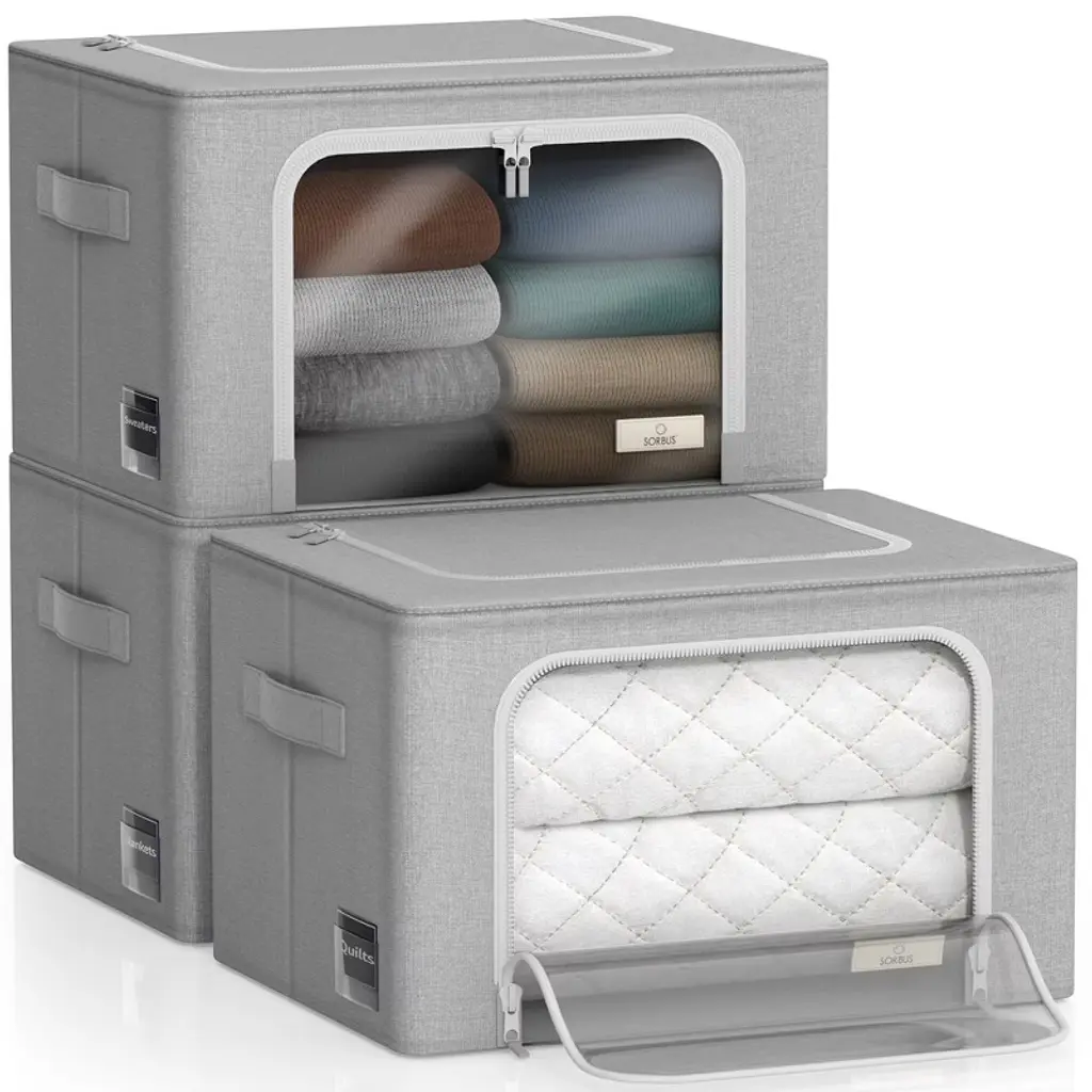 Pack, zip, and transport household essentials the Sorbus Storage Bin set! It features a front and top zipper opening, with two carry handles, and a large transparent front window. The generous size provides plenty of room for seasonal apparel, bedding, linens, holiday decorations, toys, accessories, and more. A fully zippered closure protects items from dust, pest, and water damage while the large clear window allows you to see contents at a glance. As a bonus, each bin includes a content ID window to quickly label what's inside. This set of two can be used individually or stacked together in your designated storage area. When not in use, simply collapse flat and tuck away for easy storage.