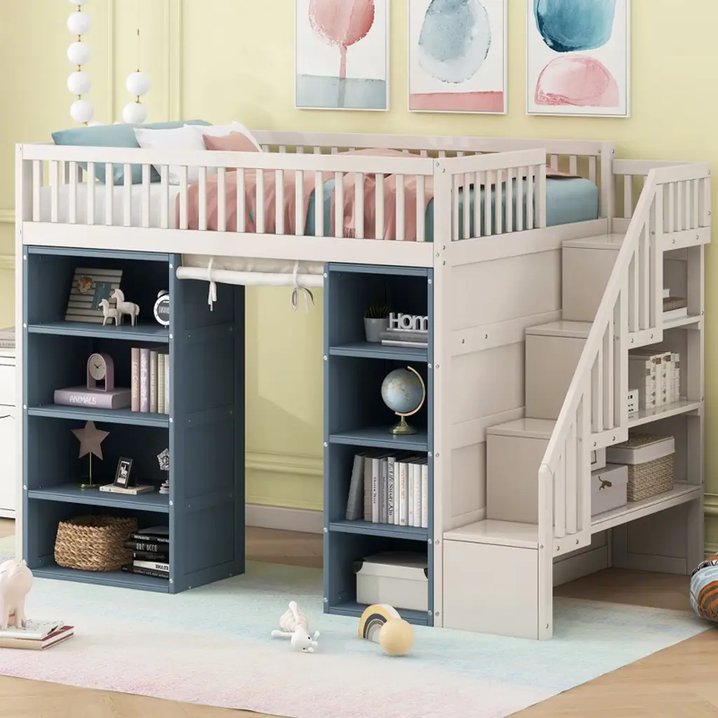 If you need extra sleeping space, this Stairway Twin-Over-Twin Bunk Bed with Storage is perfect for your home. Four open shelves located beneath the attached staircase provide ample storage for your little ones' toys and bedding. High-quality, solid pine legs and a strong, durable frame ensures stability and durability for long-term use, and can be separated into two twin size bed. Slat kit included so box springs are not required. This bunk bed is designed with a clean silhouette and a hue of elegance. It suits all styles of home decoration, and completes the look of any bedroom.Product Detail:- Product Type:Bunk Bed- Size:Twin over Twin- Overall Product Dimension:93.9"L x 42.1"W x 62.2"H- Overall Product Weight:168 LBS- Detail Dimension: Please refer to the Size picture- Weight Capacity: Upper bed: 175 LBS v / Bottom bed: 275 LBS- Material: Plywood+MDF+Pinewood- Recommended Mattress Thickness: Upper bed: 6" / Bottom bed: 8" (The mattress is not included)- Number of Packages: 3 (Packages shipped separately may not arrive at the same time, please be patient.)- Assembly Required:YesWhat's in the box:- Bed * 1- Tools included- Instruction manual