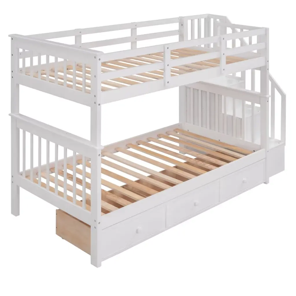 If you need extra sleeping space,this Stairway Twin-Over-Twin Bunk Bed with Three Drawers is perfect for your home. Four open shelves located beneath the attached staircase provide ample storage for your clothes and bedding. High-quality, solid pine legs and a strong, durable frame ensures stability and durability for long-term use,,and can be separated into two twin beds. Slat kit included so box springs are not required. This bunk bed is designed with a clean silhouette and a hue of elegance. It suits all styles of home decoration, and completes the look of any bedroom.Product Detail:- Product Type:Bunk Bed- Size:Twin over Twin- Overall Product Dimension:94.2"L x 42.7"W x 62.2"H- Overall Product Weight:186 LBS- Detail Dimension: Please refer to the Size picture- Weight Capacity: Upper bed: 175 LBS / Bottom bed: 275 LBS- Material: Plywood+MDF+Pinewood- Recommended Mattress Thickness: Upper bed: 6" / Bottom bed: 8" (The mattress is not included)- Number of Packages: 3 (Packages shipped separately may not arrive at the same time, please be patient.)- Assembly Required:YesWhat's in the box:- Bed * 1- Tools included- Instruction manual