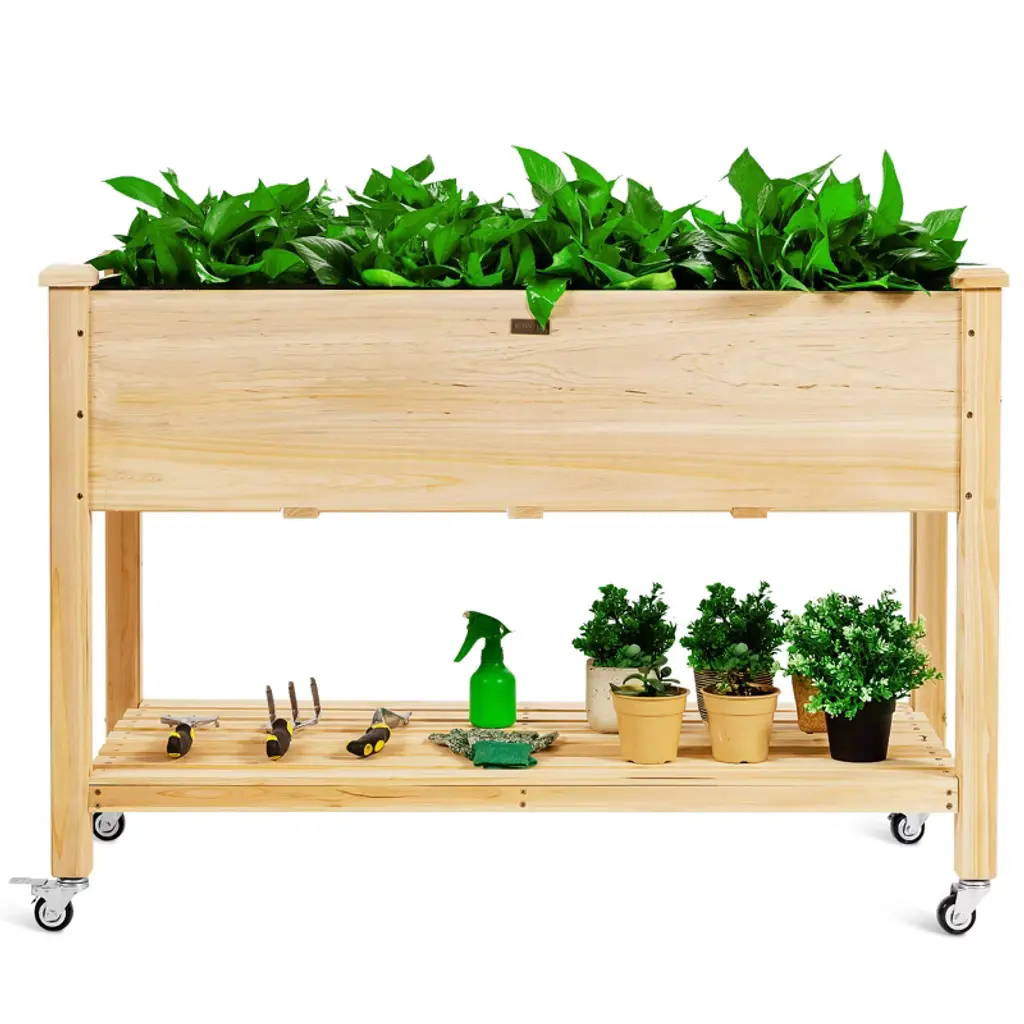 Tangkula Elevated Garden Bed Wood Planters With Storage Shelf Wheels & Liner Suitable For Vegetable Flower Herb