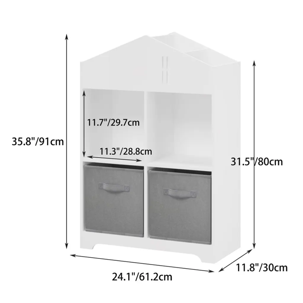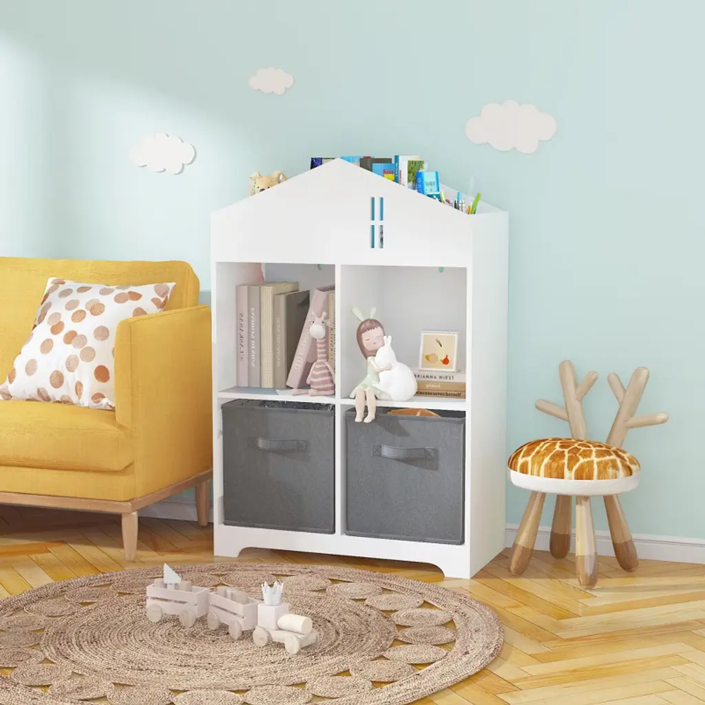 Toddler Bookshelf, 2-tier Storage Display Organizer With 2 Collapsible Fabric Drawers For Boys Girls Bedroom, Playroom House Bookshelf, Gray
