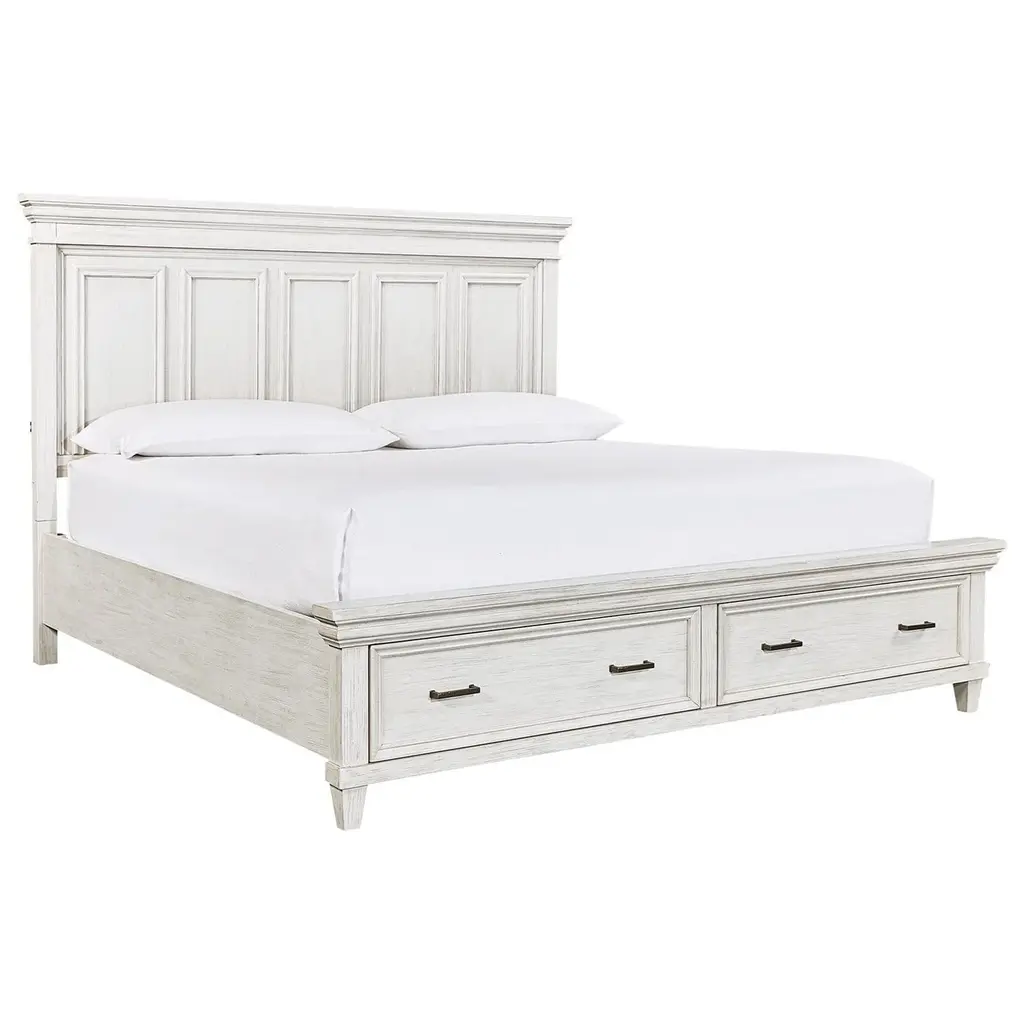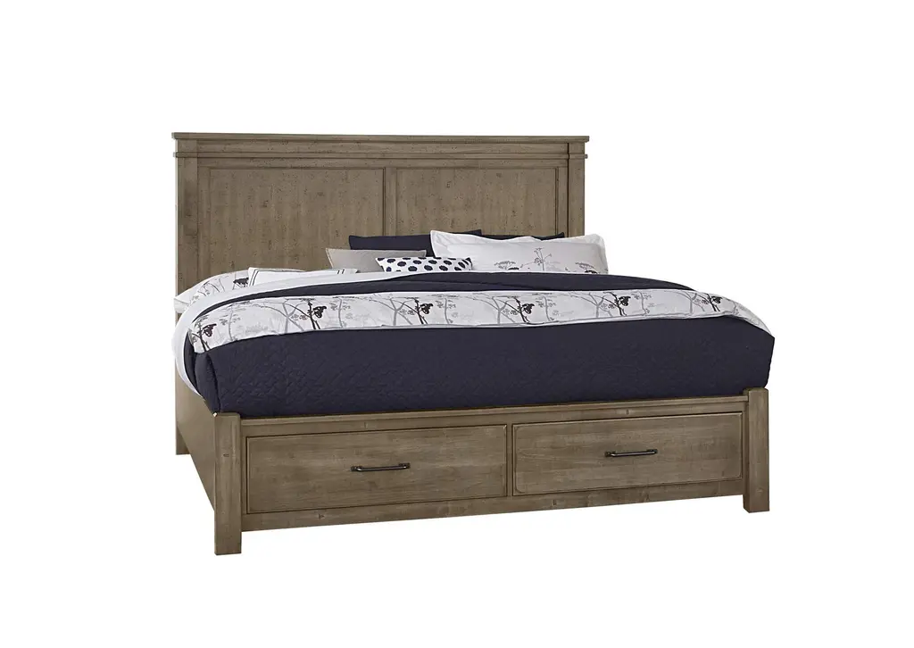 This transitional king bed is the perfect addition for anyone looking to add a bit of style to their room while saving space. Perfect for smaller spaces, this bed features storage drawers on each side to store your clothing and blankets. The mantle headboard features panel molding that carries through the footboard for an embellished yet refined look.