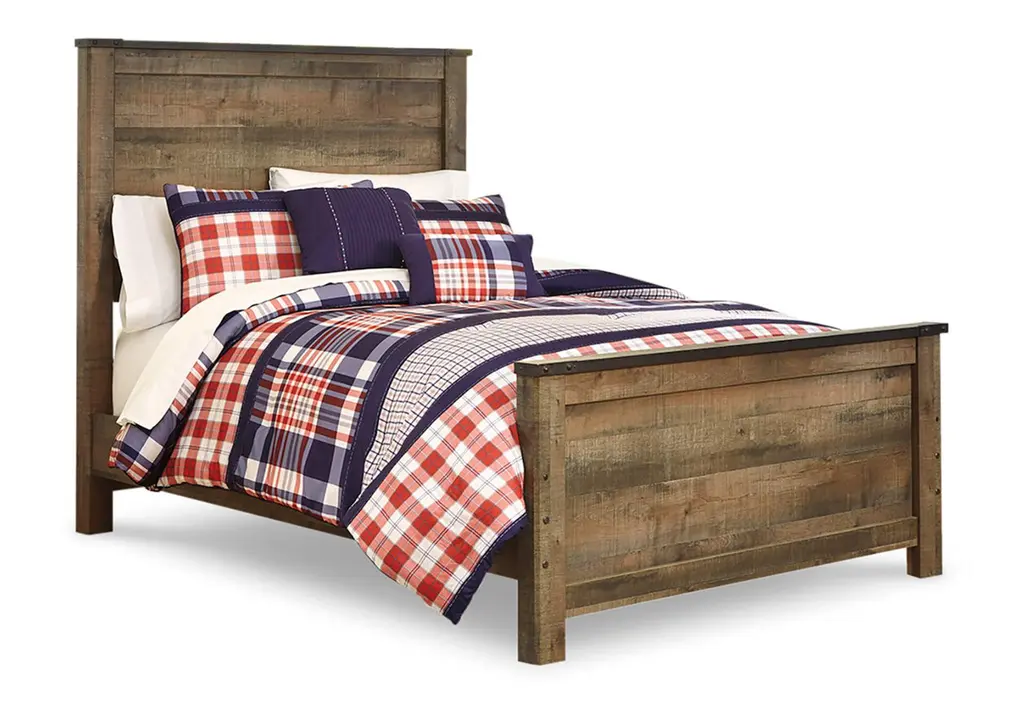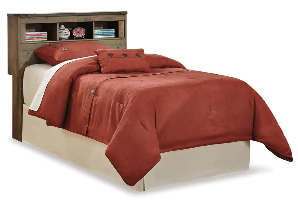 Whether she loves horses or he's a cowboy at heart, the Trinell twin bookcase bed matches their authenticity. Its rustic finish, plank-style details and nailhead trim pay homage to reclaimed barn wood, making for a chic look loaded with charm. Mattress and Weight 132.000 lbs. (59.4kgs.)