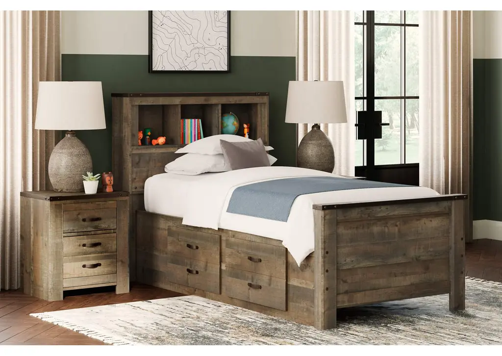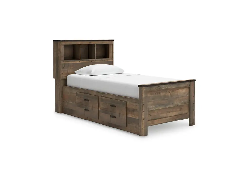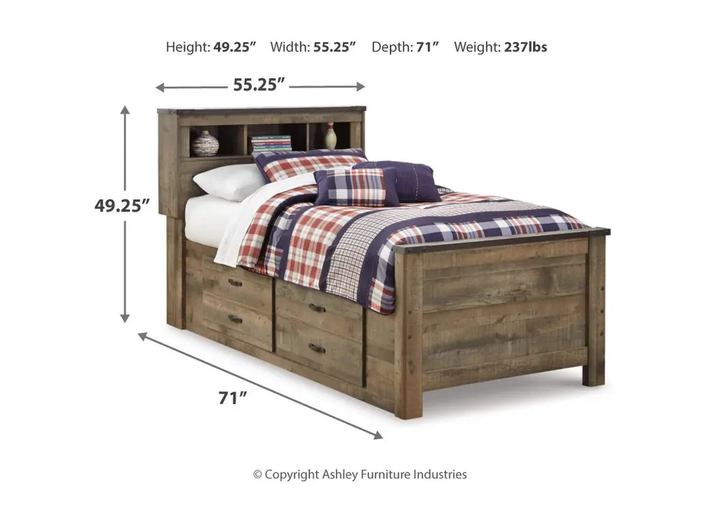 Whether she loves horses or he's a cowboy at heart, the Trinell twin bookcase bed with under bed storage matches their authenticity. Its rustic finish, plank-style details and nailhead trim pay homage to reclaimed barn wood, making for a chic look loaded with charm. Mattress available, sold separately. Weight 232.000 lbs. (104.4kgs.)