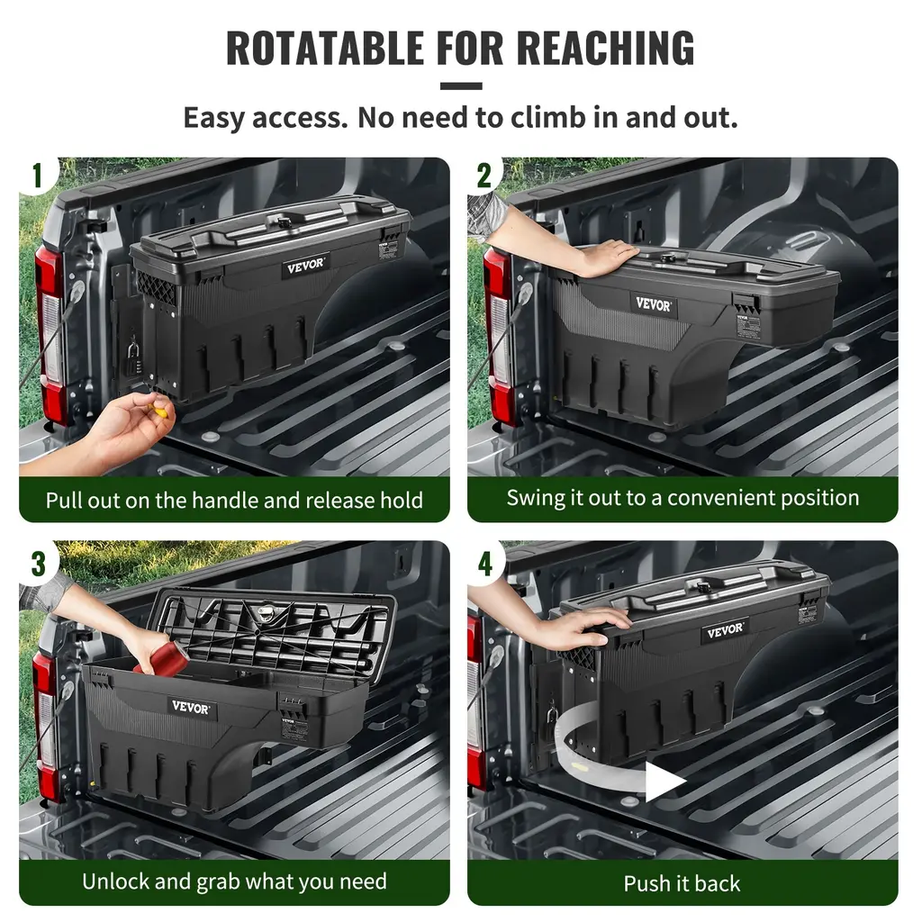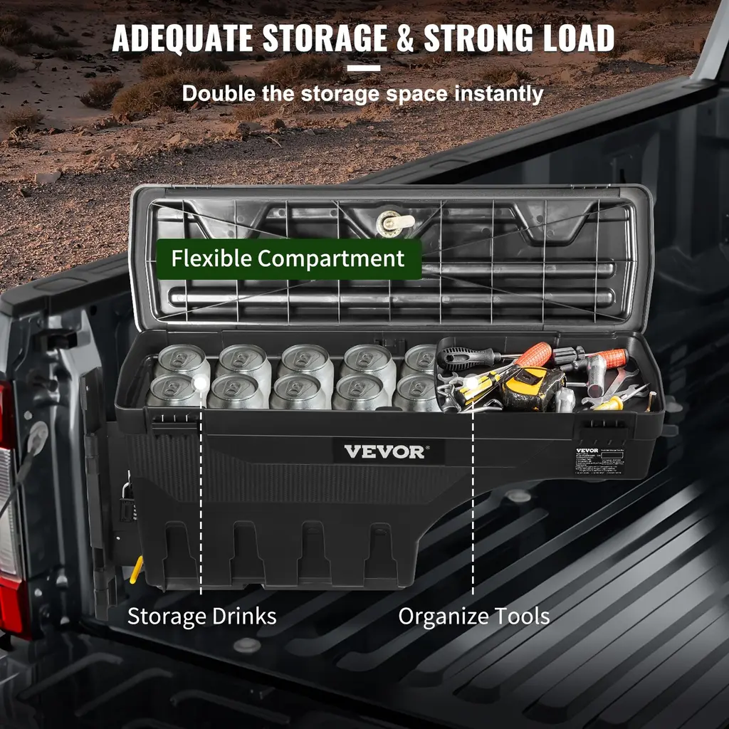 Double Layered Security: Can't find a truck bed toolbox to keep your equipment? Don't worry; you can lock everything up with VEVOR. The innovative lockable box keeps your gear secure. A bonus unpickable combination padlock provides you with double security. Our anti-theft system will be infallible to any attempt to remove it. Toughness that Can't Be Matched: High-quality ABS composite material makes the VEVOR truck bed storage box lightweight while maintaining rigidness and durability. It protects your belongings against strong wind, water, and dust, and even stands up well to sun exposure. Don't let the elements ruin your day. As sleek as it gets while easy to clean and maintain! Ultimate Accessibility Just For You: Mount the truck bed box to the wall of the bedrail on either the left or right side. Simply pull the latch to make it pivot 180 degrees, offering instant access. Leave it folded up when not in use, not taking away any precious cargo space. It always stays in place no matter how fast you are driving! Save Space Like Never Before: Stow up to 75 pounds of gear in the wheel well truck box to improve your bed's organization and free up room for larger items. Maximum 6.6 Gal/25 L storage space for 2015-2021password padlock ;Maximum 6.6 Gal/20 L storage space for 2017-2021 passenger side;Maximum 6.6 Gal/20 L storage space for 2017-2021driver side ;Maximum 6.6 Gal/20 L storage space for 2019-2020 password padlock some snacks, tools, gloves, bottled drinks, etc. Different compartments allow you to organize your belongings in a breeze. A Cut Above The Rest: Compatible the wheel well tool case preserves 3" clearance and works with nearly all tonneau covers. Quick installation with eyelets to conveniently secure the box to the bed. Engineered for exact fittings, they meet or even exceed OEM equivalents. Add them to your car today, and enjoy the ride you deserve! *Product accessories have been iteratively upgraded. If customers have accessories/installation problems after receiving the product, please feel free to contact us. Package Content 1 x Toolbox 8 x ST6.3x25 Screws 4 x M8 Nuts 2 x Plastic Buckles 2 x Rubber Pads 1 x Key 1 x Password Padlock