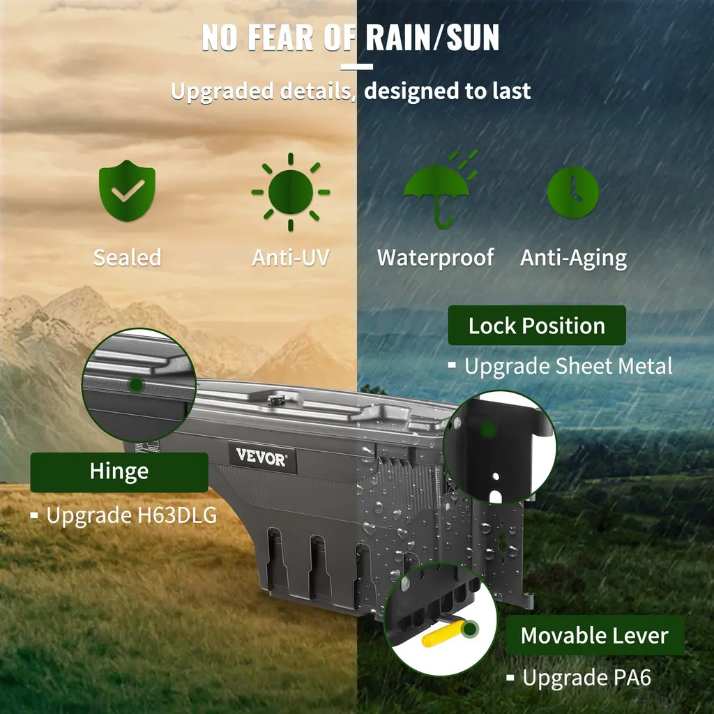 Double Layered Security: Can't find a truck bed toolbox to keep your equipment? Don't worry; you can lock everything up with VEVOR. The innovative lockable box keeps your gear secure. A bonus unpickable combination padlock provides you with double security. Our anti-theft system will be infallible to any attempt to remove it. Toughness that Can't Be Matched: High-quality ABS composite material makes the VEVOR truck bed storage box lightweight while maintaining rigidness and durability. It protects your belongings against strong wind, water, and dust, and even stands up well to sun exposure. Don't let the elements ruin your day. As sleek as it gets while easy to clean and maintain! Ultimate Accessibility Just For You: Mount the truck bed box to the wall of the bedrail on either the left or right side. Simply pull the latch to make it pivot 180 degrees, offering instant access. Leave it folded up when not in use, not taking away any precious cargo space. It always stays in place no matter how fast you are driving! Save Space Like Never Before: Stow up to 75 pounds of gear in the wheel well truck box to improve your bed's organization and free up room for larger items. Maximum 6.6 Gal/25 L storage space for 2015-2021password padlock ;Maximum 6.6 Gal/20 L storage space for 2017-2021 passenger side;Maximum 6.6 Gal/20 L storage space for 2017-2021driver side ;Maximum 6.6 Gal/20 L storage space for 2019-2020 password padlock some snacks, tools, gloves, bottled drinks, etc. Different compartments allow you to organize your belongings in a breeze. A Cut Above The Rest: Compatible the wheel well tool case preserves 3" clearance and works with nearly all tonneau covers. Quick installation with eyelets to conveniently secure the box to the bed. Engineered for exact fittings, they meet or even exceed OEM equivalents. Add them to your car today, and enjoy the ride you deserve! *Product accessories have been iteratively upgraded. If customers have accessories/installation problems after receiving the product, please feel free to contact us. Package Content 1 x Toolbox 8 x ST6.3x25 Screws 4 x M8 Nuts 2 x Plastic Buckles 2 x Rubber Pads 1 x Key 1 x Password Padlock