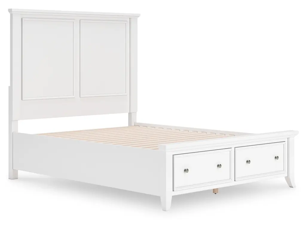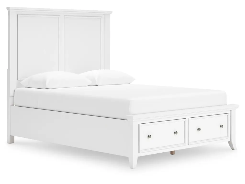 Clean, crisp and utterly contemporary. Brighten up your bedroom with the Trulani queen panel bed with storage. From linens to clothes to everyday clutter, the storage drawers keep things looking tidy. Pair it with pops of color, or let the fresh-feeling white finish speak for itself—its versatile hue effortlessly adapts to your changing tastes. Stylized flare legs and chic headboard detailing further elevate the look.
