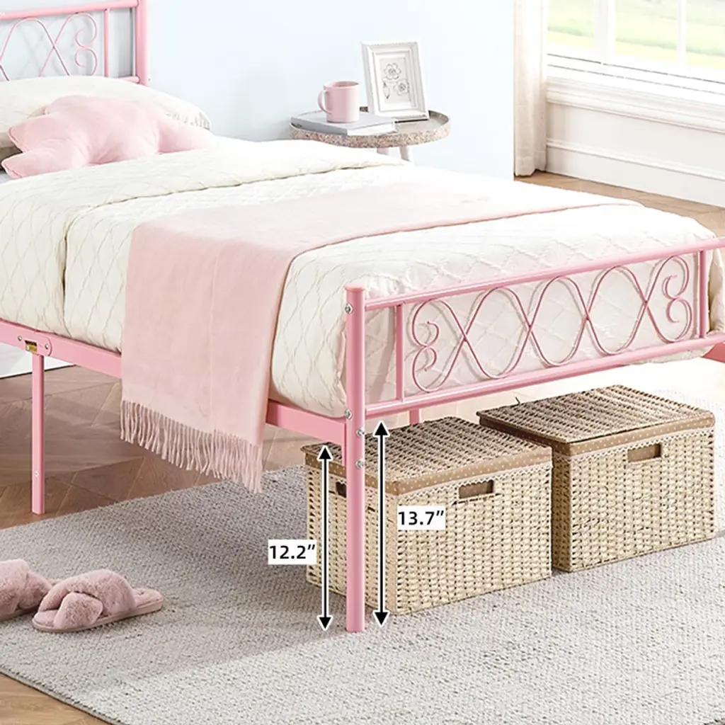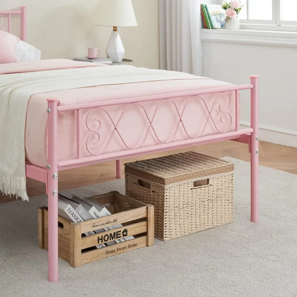 Twin Bed Frame With Headboard And Footboard -Pinkmetal Platform Bed Frame With Iron-art Sweet Heart, No Box Spring Needed, Under Bed Storage, Easy