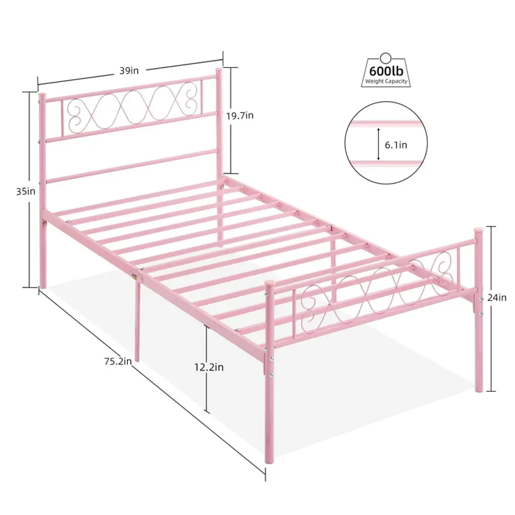 Enhance your bedroom with this stylish and durable Bed Frame with Headboard and Footboard, designed to provide both comfort and elegance for girls and boys alike. Crafted from sturdy metal, this platform bed features robust side rails, center support, and strong support legs, ensuring reliable load-bearing capacity—up to 600 pounds for Twin size and up to 800 pounds for Full and Queen sizes. The eye-catching heart-shaped design of the headboard and footboard adds a warm, romantic touch to any room, making it an ideal centerpiece. Its smooth surface not only enhances aesthetic appeal but also prevents scratches, ensuring long-lasting beauty. Enjoy the convenience of ample under-bed storage with 12.2 inches of clearance, perfect for organizing clothes, shoes, bags, suitcases, and other essentials without taking up additional space. The frame includes soundproofing cotton to minimize friction noise, providing a quiet, restful sleep environment every night. Designed with easy assembly in mind, the package comes with detailed, numbered instructions and all necessary components, allowing you to set up your new bed quickly and effortlessly. This lightweight yet sturdy metal bed frame is perfect for kids’ bedrooms, guest rooms, or any space where durability and style are desired. No box spring is needed, making it a practical, space-saving choice that combines functionality, elegance, and ease of assembly. Choose this charming bed frame to create a cozy, organized, and stylish bedroom environment.