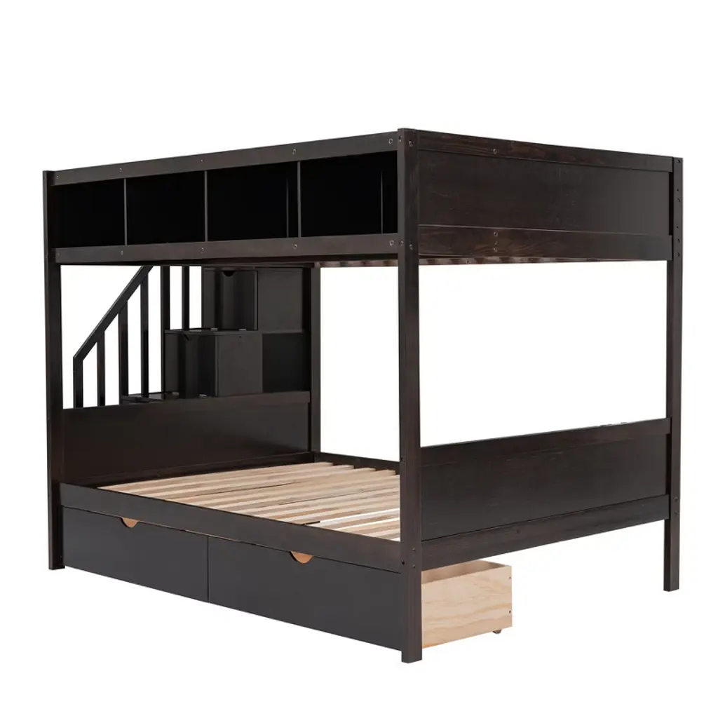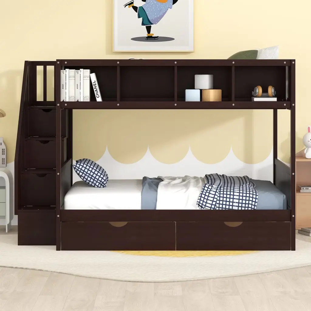Twin Over Full Bunk Beds With Staircase And Drawers, Wooden Bunk Bed Frame With Storage Shelf For Kids, Espresso