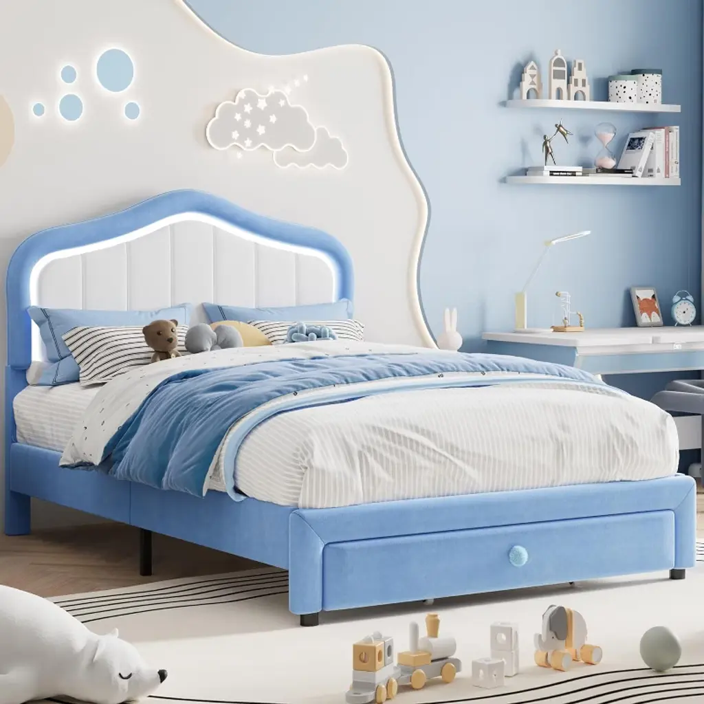 Twin Xl Upholstered Platform Bed Frame With Led Lights & Storage Drawer - Velvet Headboard, Wood Slat Support, No Box Spring Needed, Blue