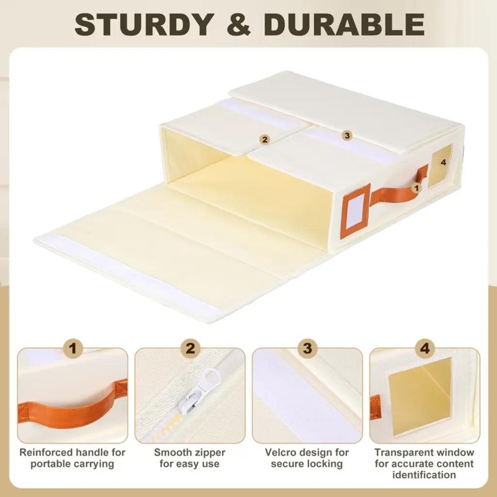 This sheet organizer is made of sturdy Oxford cloth (not thin non-woven fabric) and features reinforced handles for added durability. It's made of corrugated plastic (not cardboard) to resist moisture and deformation. It has ample space for a king/queen sheet set, a duvet cover, and two pillowcases. A transparent window makes it easy to identify sheet colors. The included labels allow you to quickly mark your sheets by size or style for easy access. Easy to fold and use: Simply fold the sheet set in the middle, zip it up, close the door, and attach the labels.