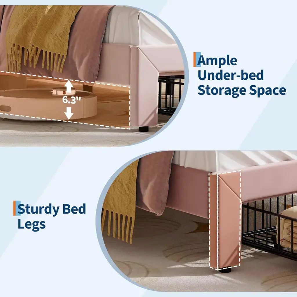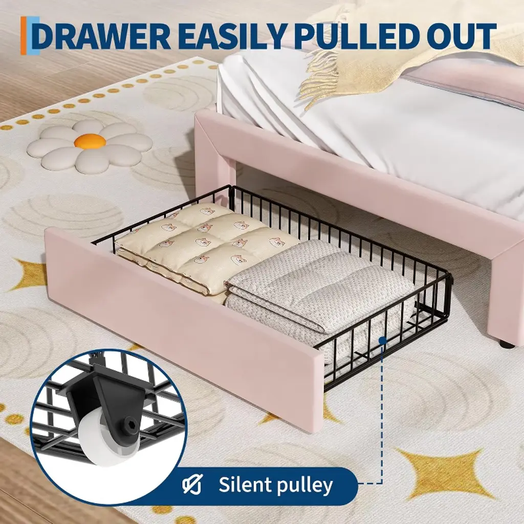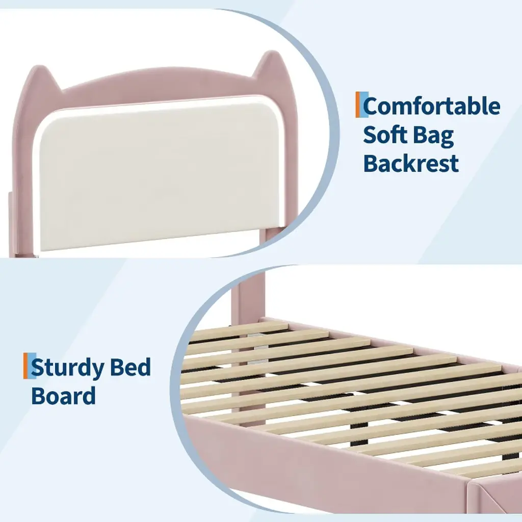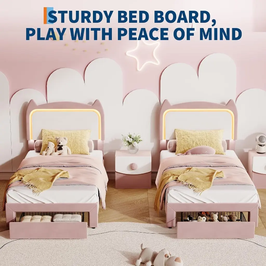 Kids Bed Frame with Storage Drawer & Cat HeadboardAre you looking to make bedtime magical for your child? Imagine their excitement as they drift off surrounded by soft velvet and a whimsical cat-shaped headboard. Wouldnt it be amazing to choose from millions of colorful LED lights and create the perfect mood for every night? How much easier would life be with extra storage and a bed thats simple to assemble and keep clean? What if you could give your child a cozy, supportive space thats both stylish and practical? Why settle for ordinary when you can transform their room into a dreamy retreat theyll love?Highlights at a Glance: Unique cat-shaped velvet headboardFun RGB LED lighting with remote/appSpacious under-bed clearance for storageSturdy metal frame and wood slatsNo box spring needed, easy assemblySpecification:Size: Twin/ FullWeight Capacity: 800 lbs (Twin)/ 1000 lbs (Full)Material: Engineered Wood + MetalPacking List:1 x Kids Bed Frame1 x Assembly Kit1 x Instruction ManualFriendly Note:Assembly by adults is required. All necessary hardware and instructions are included.Mattress is not included.