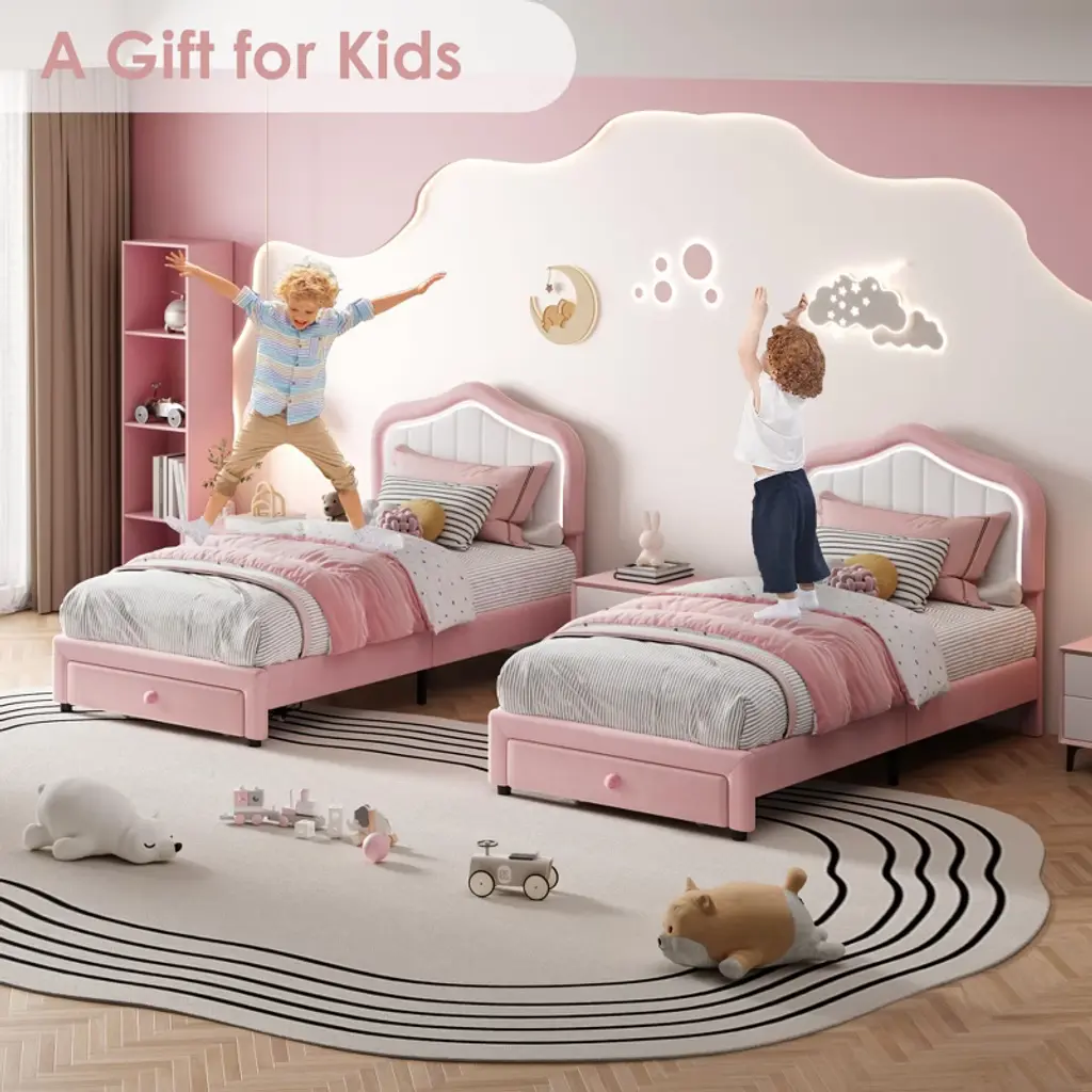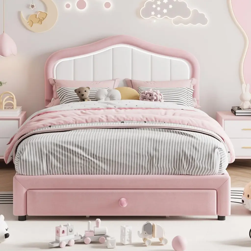 Upholstered Led Bed Frame With Storage Drawer, Velvet/princess Platform Bed Frame For Kids/girls Full-pink And White