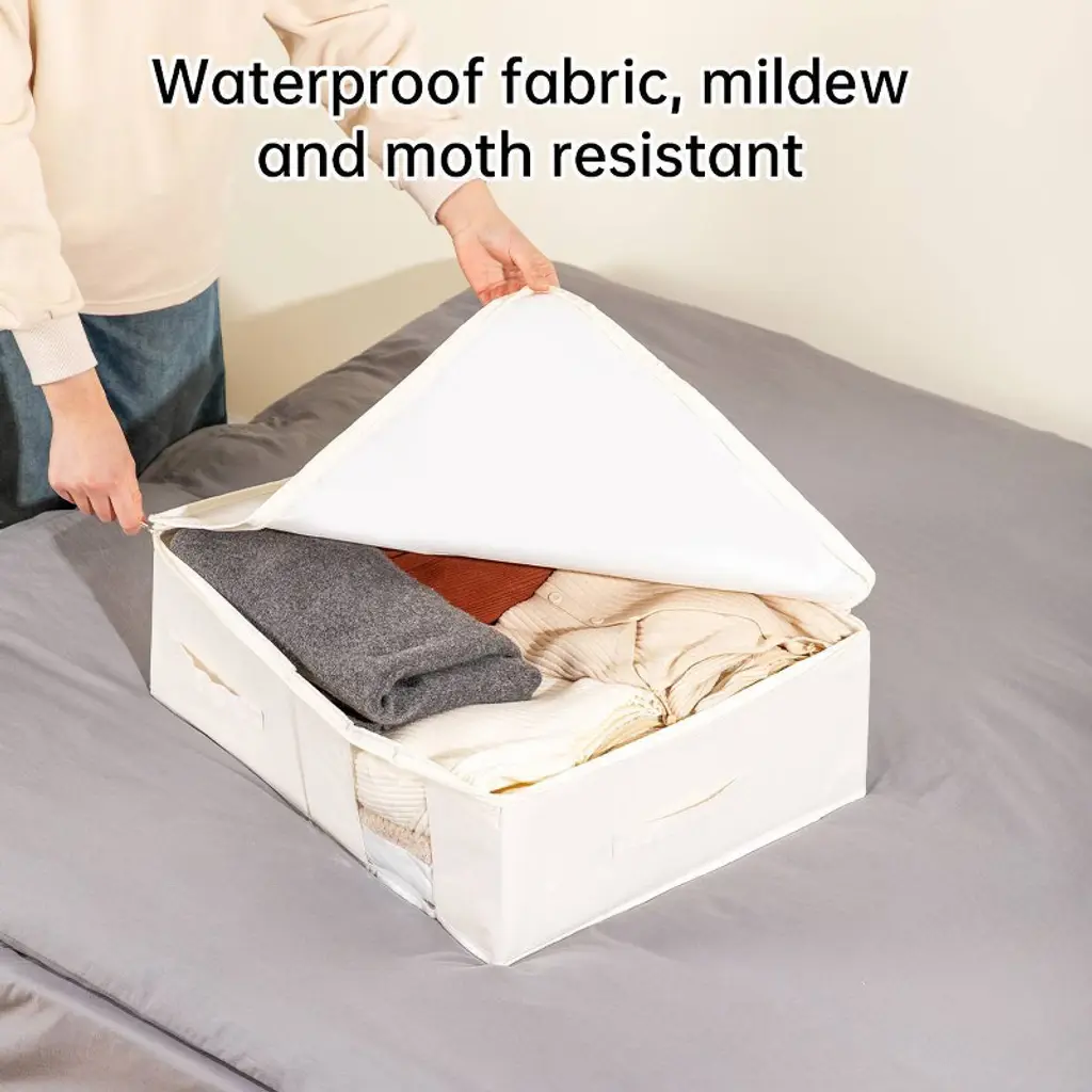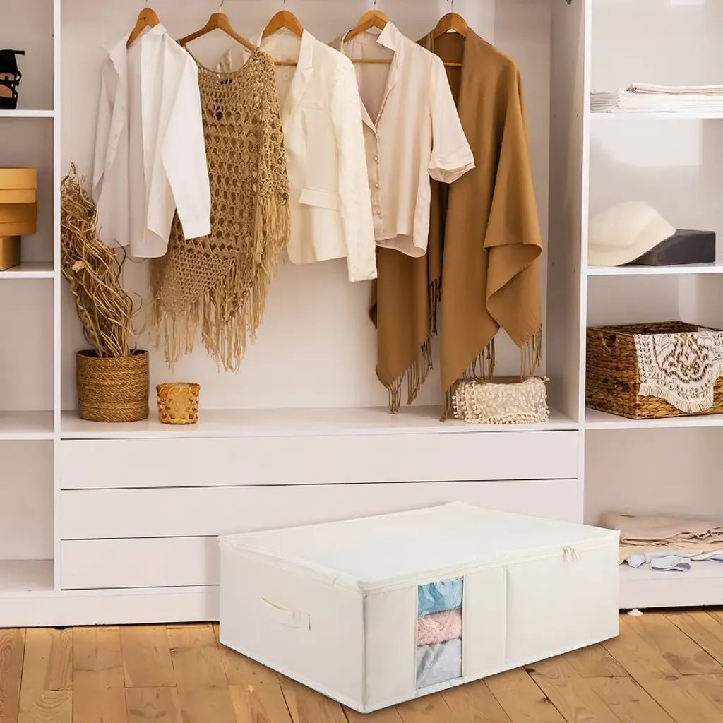 Organize your space with the VUSIGN Under Bed Storage Containers featuring a convenient window for easy visibility of contents. Each foldable storage bag (22 x 17.6 x 7.2 inch) is designed with internal plastic support to maintain shape, making them perfect for storing blankets, clothing, comforters, linen sheets, and even wrapping paper. Made from waterproof fabric, these bags are also easy to clean, ensuring hassle-free maintenance. This 3-pack set comes in a sleek white ivory color, blending seamlessly with any room decor. Ideal for closets or under the bed, these storage bags help maximize space while keeping your items clean, accessible, and neatly stored.