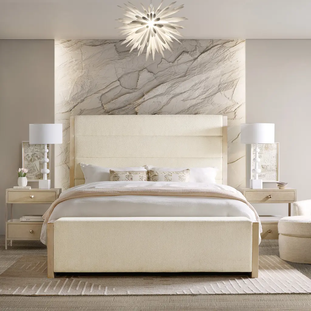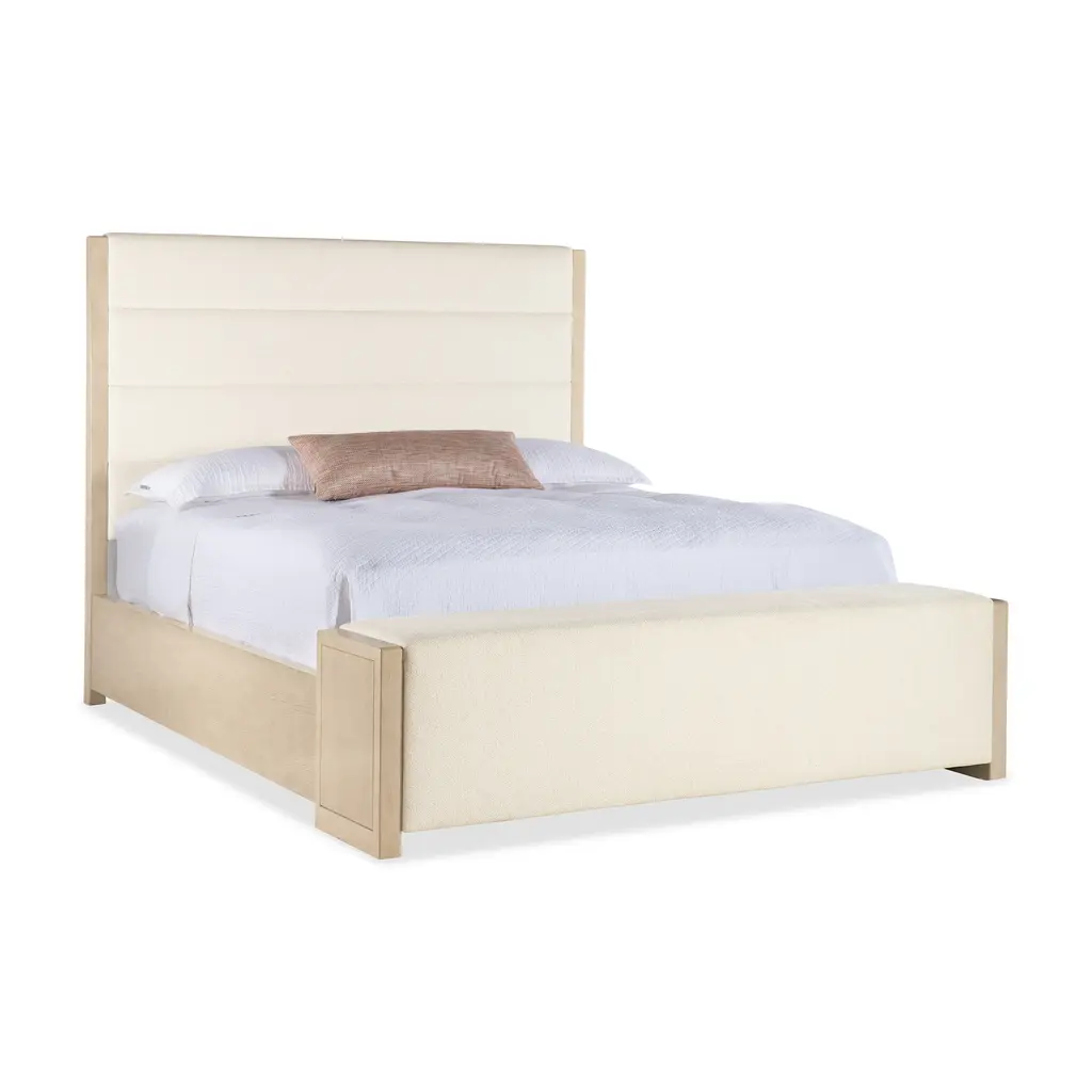 Indulge in total luxury with the Westwood Upholstered Storage Bed from Hooker Furniture. Boasting performance fabric upholstery and a sleek horizontal channel design, this bed adds both style and functionality to your bedroom. The hidden storage drawers in the bench footboard offer a perfect solution for keeping linens and essentials organized. Crafted with quartered oak veneers and a Polished Limestone finish, this modern and practical bed is a must-have for any sophisticated home. Highlights