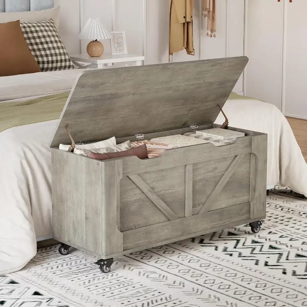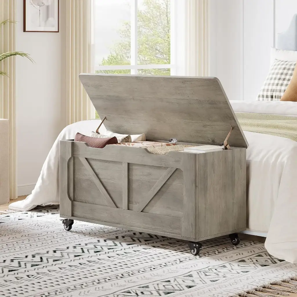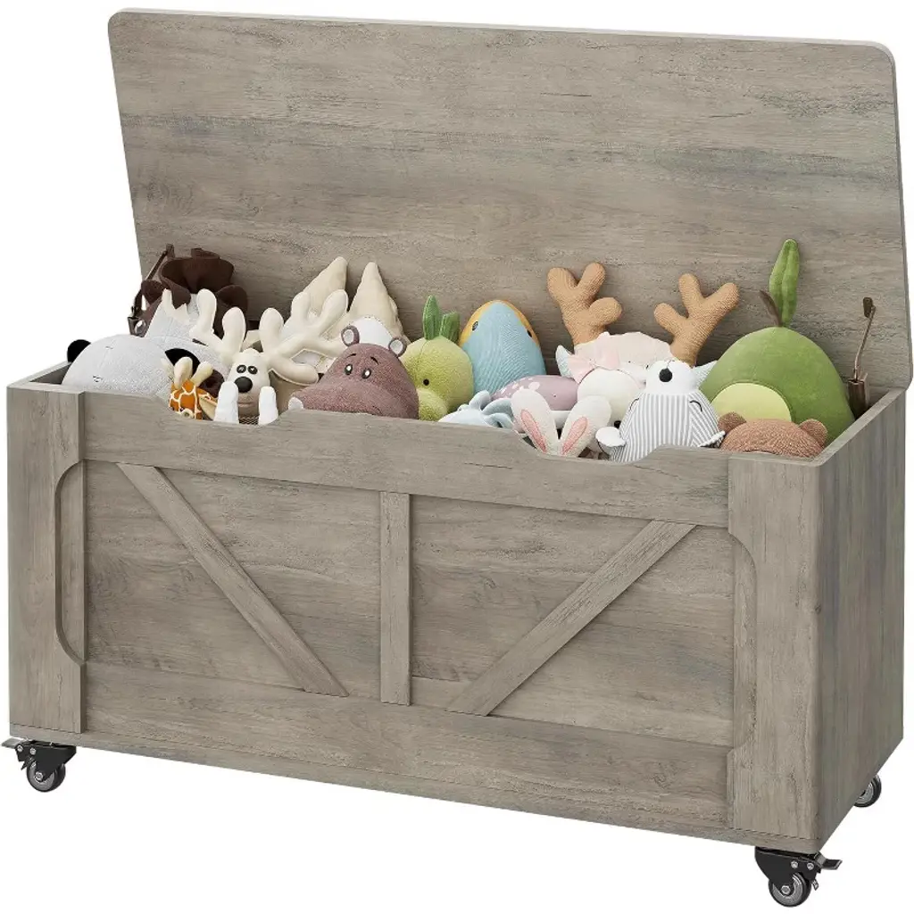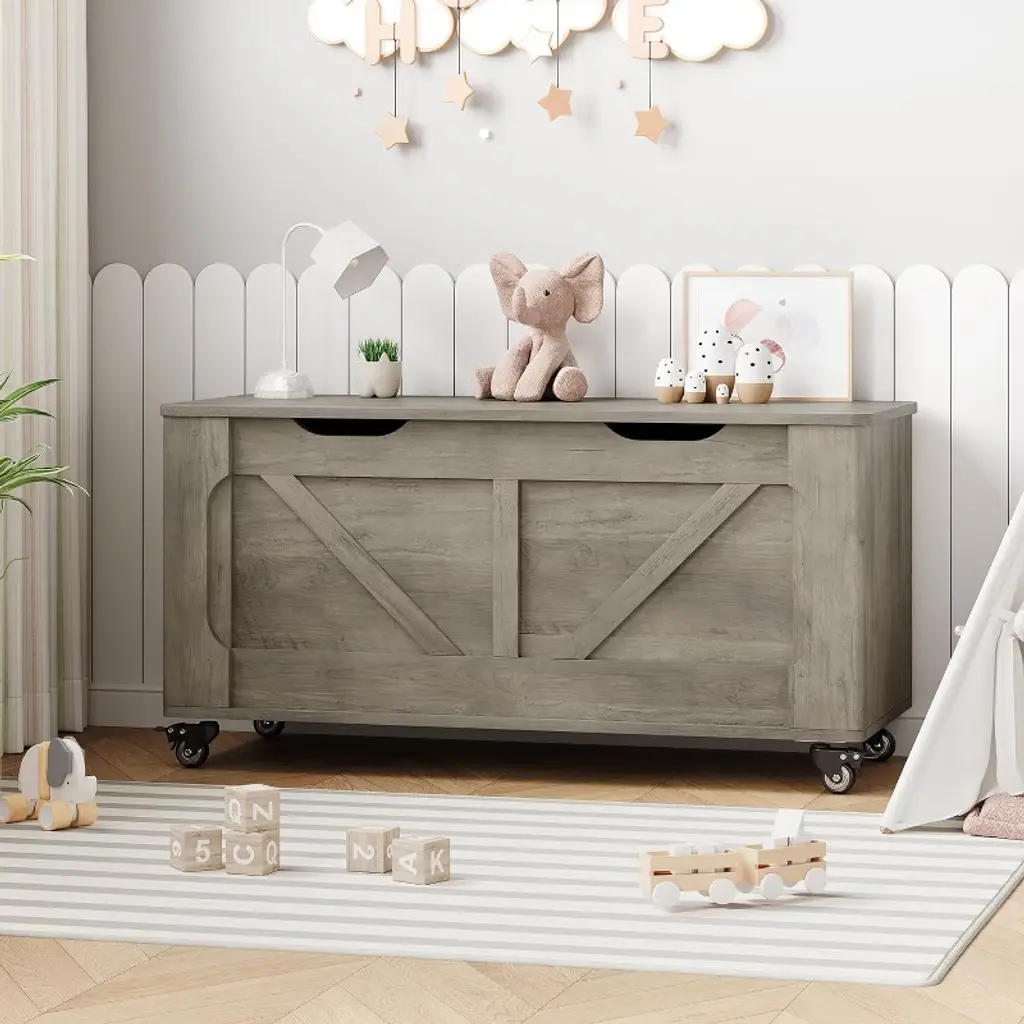 Wooden Rolling Storage Chest Bench, 100cm Organizer With U-shaped Handle, Safe Hinges, Rounded Edges, For Kids Room, Bedroom Or Living Room, Grey