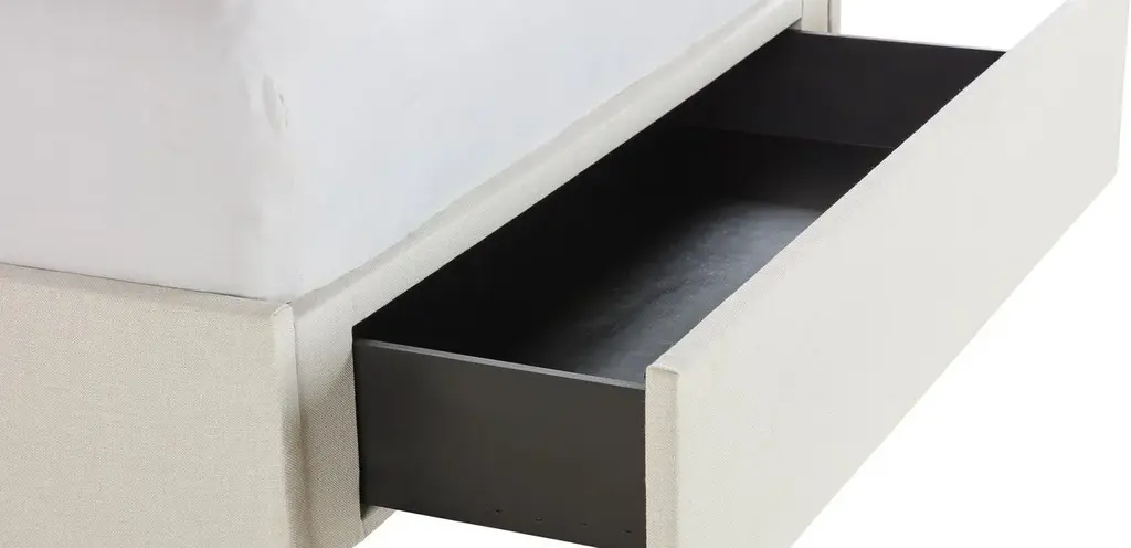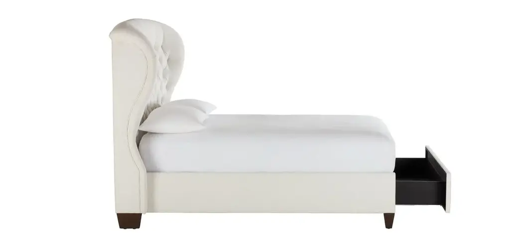 With its dramatic tufted headboard overhead and an oh-so-helpful storage drawer in the base, our Woolson bed is functional and fabulous showpiece for any luxurious bedroom. Design yours in your favorite fabric, adding optional nailhead if you choose, and our craftspeople will make it to order.