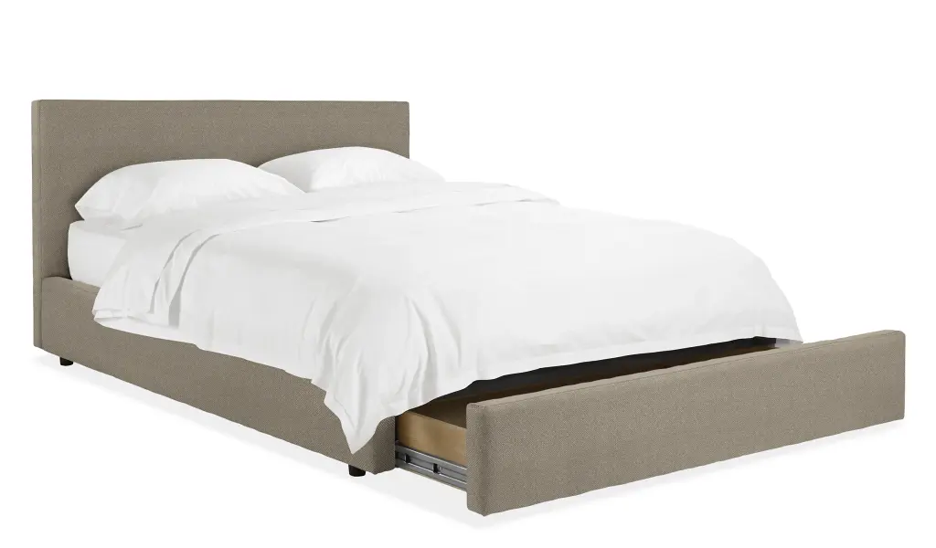 With its modern low profile, our Wyatt bed brings streamlined style and soft upholstery to your bedroom. And with its hidden drawer that slides out from the foot or the easy lift-up option, the hidden storage under the bed gives you plenty of convenient space.
