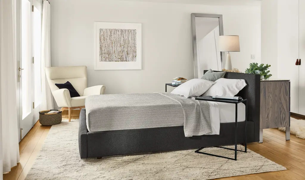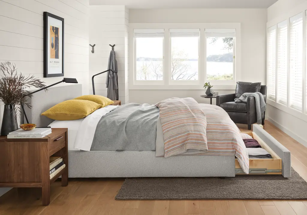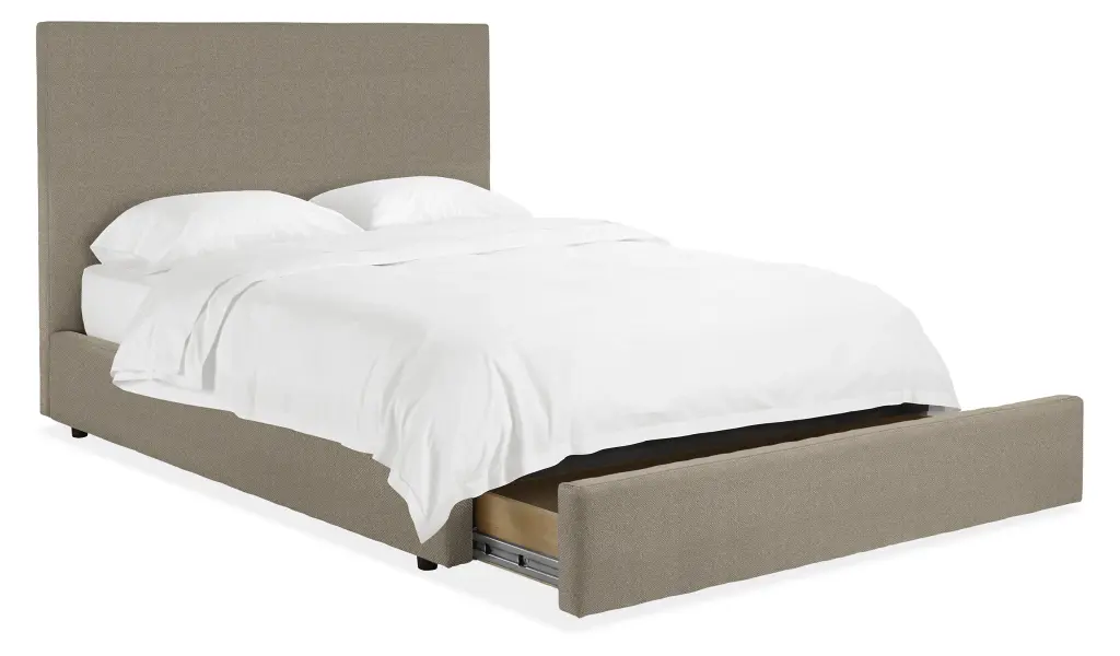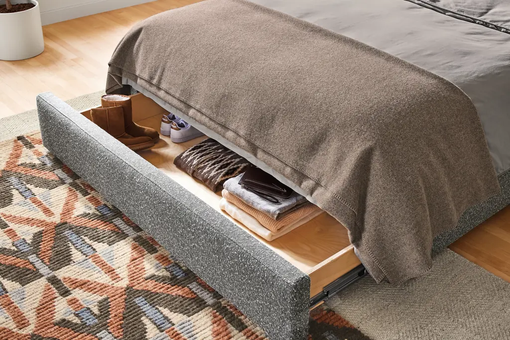 With its modern low profile, our Wyatt bed brings streamlined style and soft upholstery to your bedroom. And with its hidden drawer that slides out from the foot or the easy lift-up option, the hidden storage under the bed gives you plenty of convenient space.