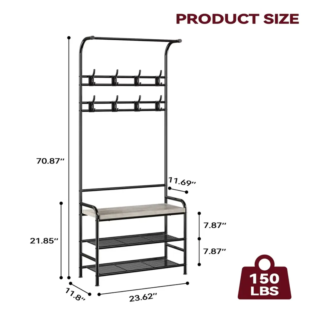 【STABLE & STURDY】This hallway coat rack made of high quality iron metal frame and wood, and it is more durable and strong. This Hall Tree have 8 double head Hooks and can be replaced as needed, each can load 6 lbs, each bottom shelf can load 11 lbs. The seat panels of the shoe bench can load over 200 lbs. 【3-IN-1 ORGANIZER】The perfect integration of Top Shelf, Coat rack, hanging bar, Hooks and Shoe storage bench. So you can tidy up your front hall space of clothes, bags, umbrellas, and store your shoes, storage boxes. You can also place your Green plants in the top shelf to make your space look more vivid. Entryway Coat will store many things in limited space, keep your home clean and save your space. 【2 Shelves】: You can put shoes or bags on the three shelves of the hall tree, and it provides a sturdy bench that can hold up to 200 pounds, and you can sit on it and change your shoes. It gives you a convenient and sturdy place to sit while putting on or taking off shoes. In addition, you can also place potted plants, flowers on the top shelf. 【Easy to Assemble】This free standing Coat Rack Shoe Bench is simply constructed. All labeled pieces, tools and instructions are smartly packed in 1 box. With the help of these tools, you can set up the hall tree bench easily and quickly. 【Wide application】The perfect combination of vintage and industrial modernization.The elegant and classic design can be perfectly integrated into the hallway, living room and bedroom of your home. And it is suitable for entryway, hall, foyer, hallway, bedroom, mudroom or office.