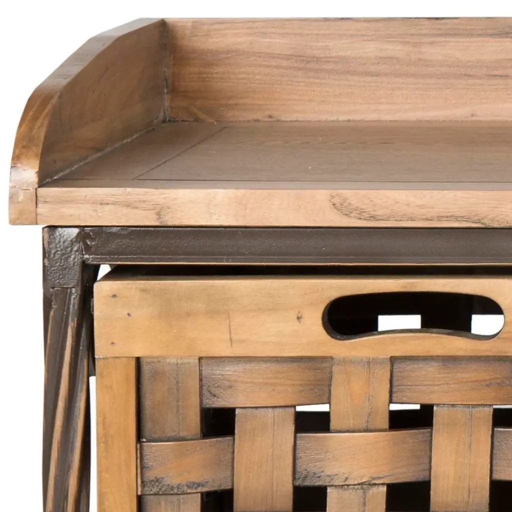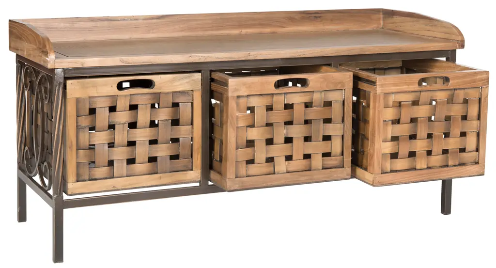 After braving the weather, unpack and unwind on the wooden storage bench with sturdy elm wood seat in a oak finish.Three wood storage bins with cutout fronts allow you to see where you've stowed excess hats, scarves and shopping totes. Wood is a natural material with variations of color shade, configuration, streaks, and grain structure. Each individual piece of furniture has characteristic markings that will differ from photo and showroom Samples. Regular attention and maintenance of fine furniture can ensure it's beauty for years to come. Always use felt pads under all articles to prevent discoloration or softening of the lacquer. Plastic and rubber bases on items can discolor wood.