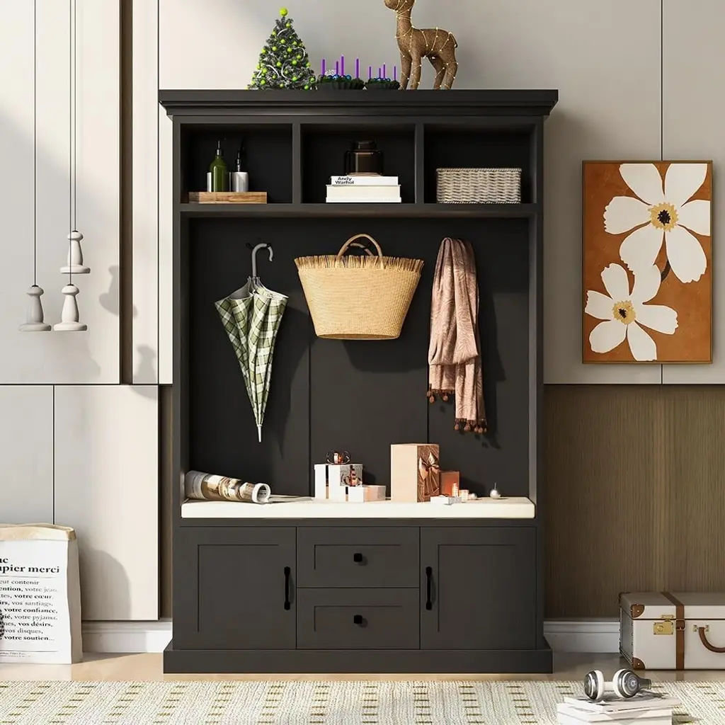 47''hall Tree With Storage Bench,3 In 1Wood Coat Rack With 2-Door Cabinet And 3 Shelves 3 Hooks,open Storage Shelves Shoe Bench - Black
