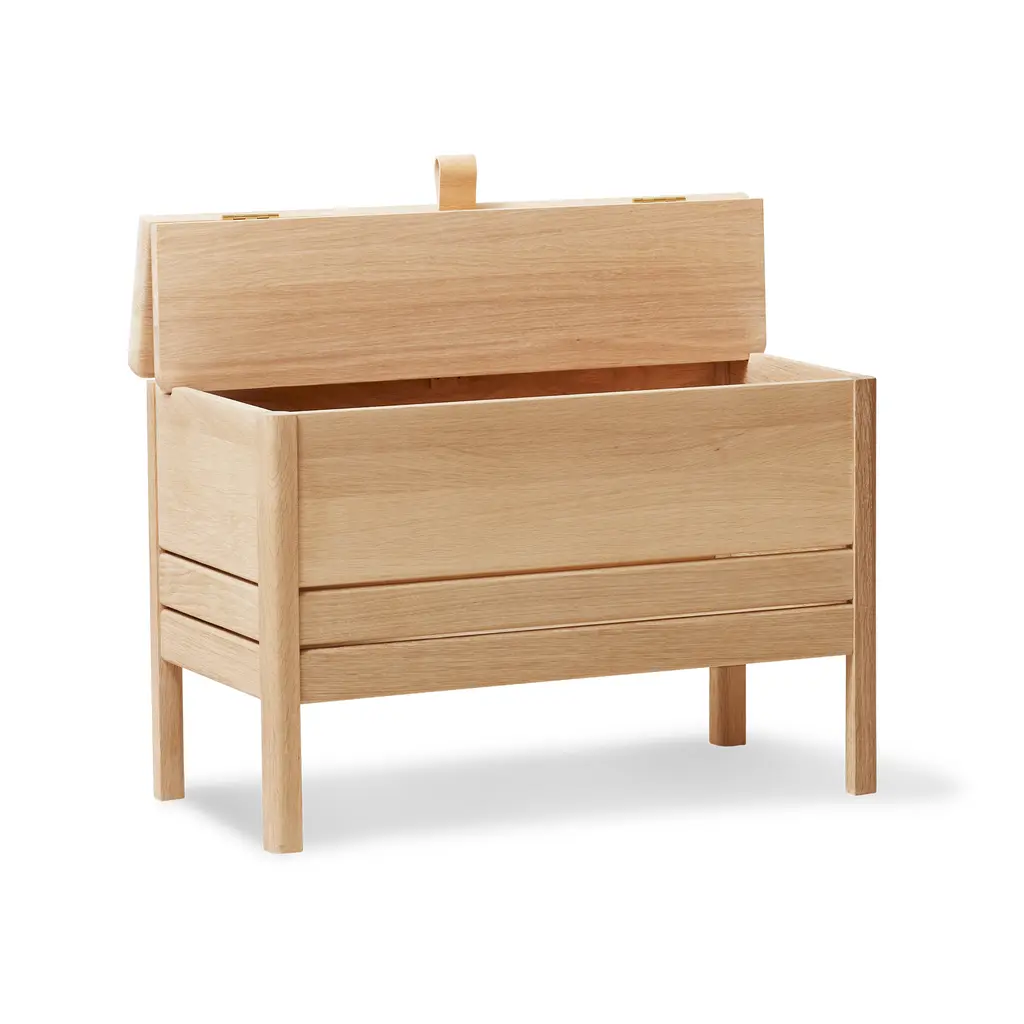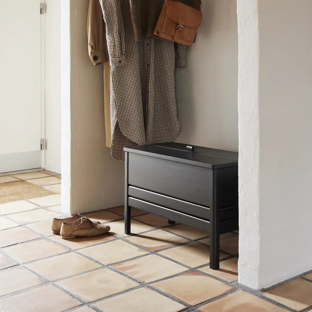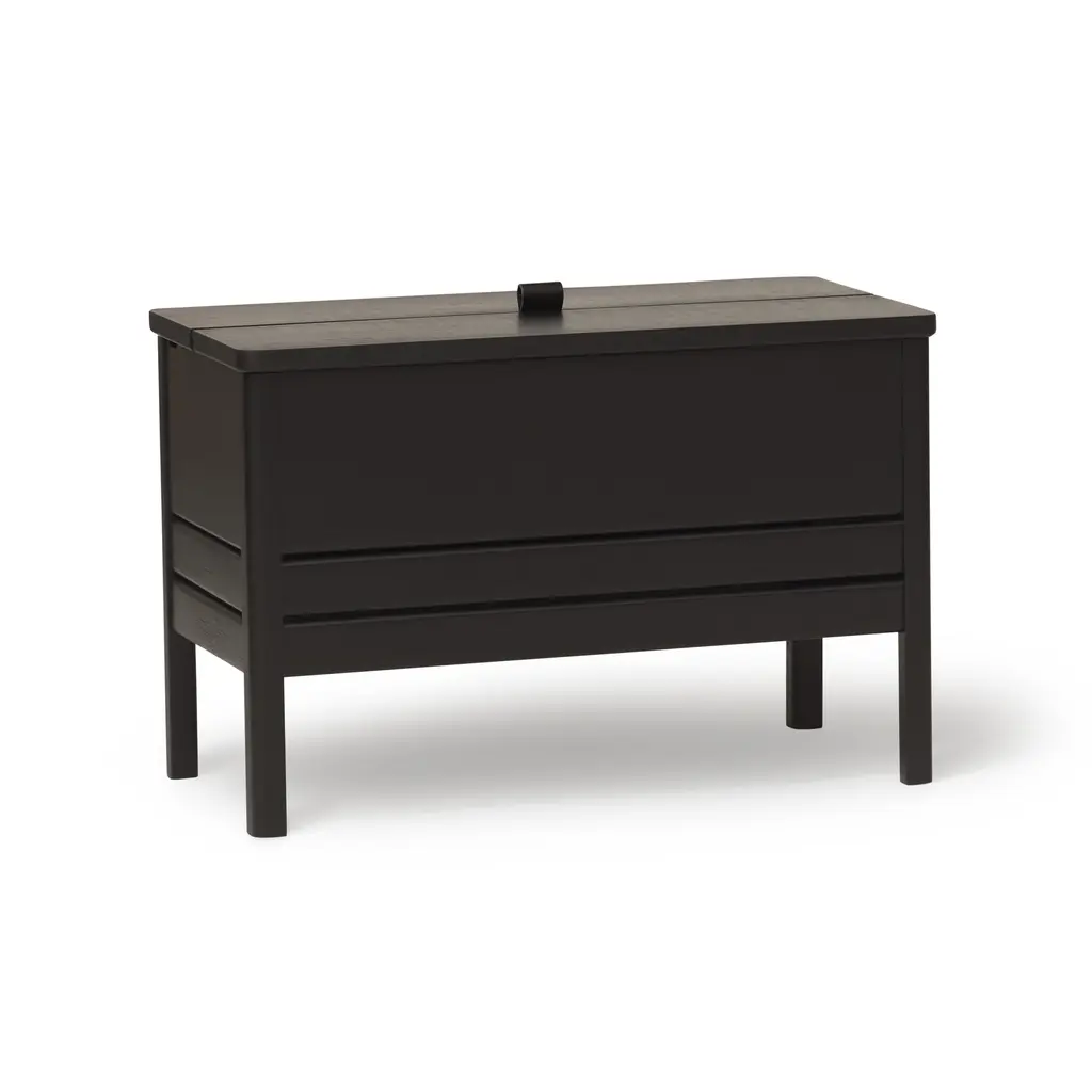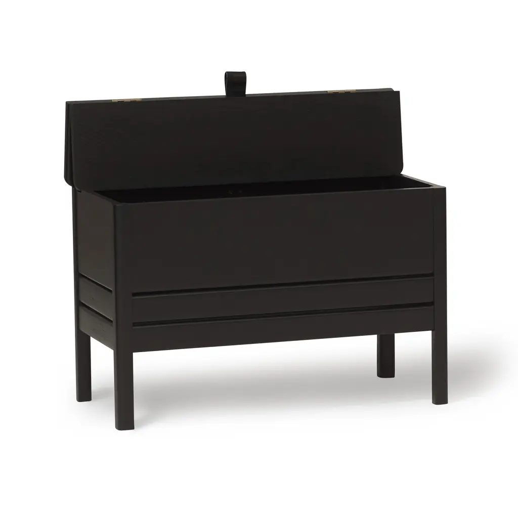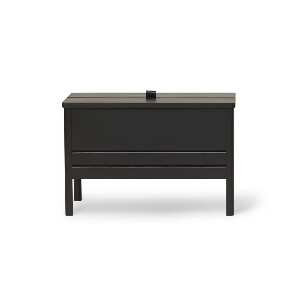This modern take on the classic stowaway bench beautifully merges practicality with sleek design. Crafted to be both sturdy and adaptable, this bench features a more compact and lightweight structure, yet maintains a minimalist and refined appearance. Its practicality is highlighted by a substantial storage space, divided into two distinct compartments for organized storing. The bench is designed with user convenience in mind. It features a small leather handle for easy lifting of the lid, and the construction is such that the lid remains securely open during use. This thoughtful design element enhances the bench’s functionality while adding a touch of elegance. Available in both natural oak and a sophisticated black-stained oak, this bench offers versatility in its aesthetic appeal, easily fitting into various decor styles. Whether placed in a hallway, bedroom, or living area, this updated stowaway bench is an exemplary fusion of style, utility, and contemporary design.