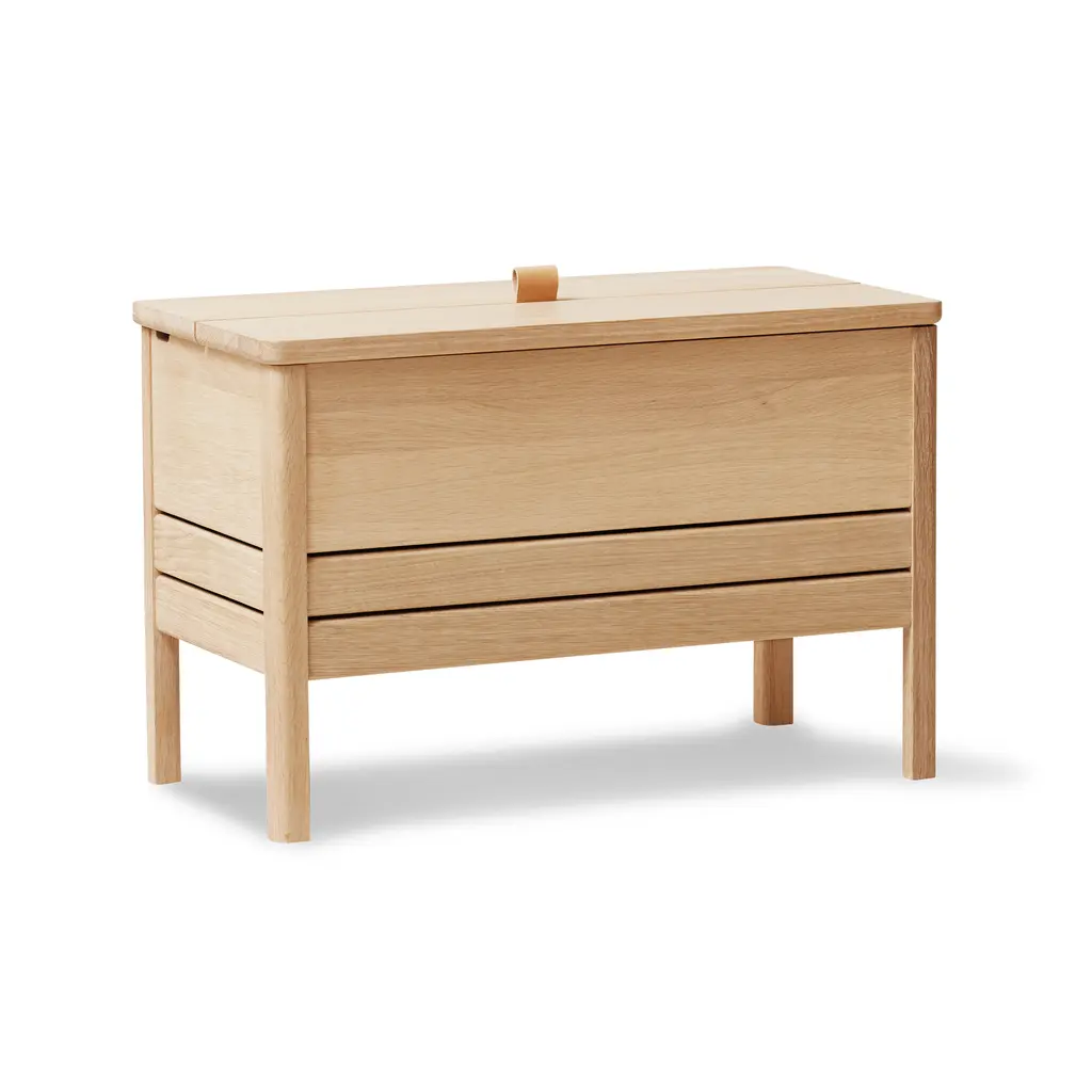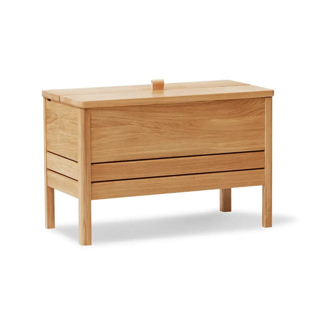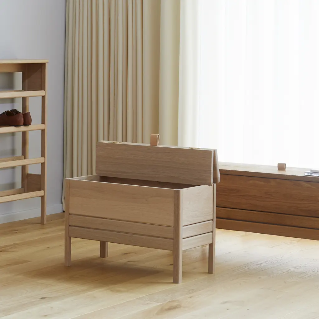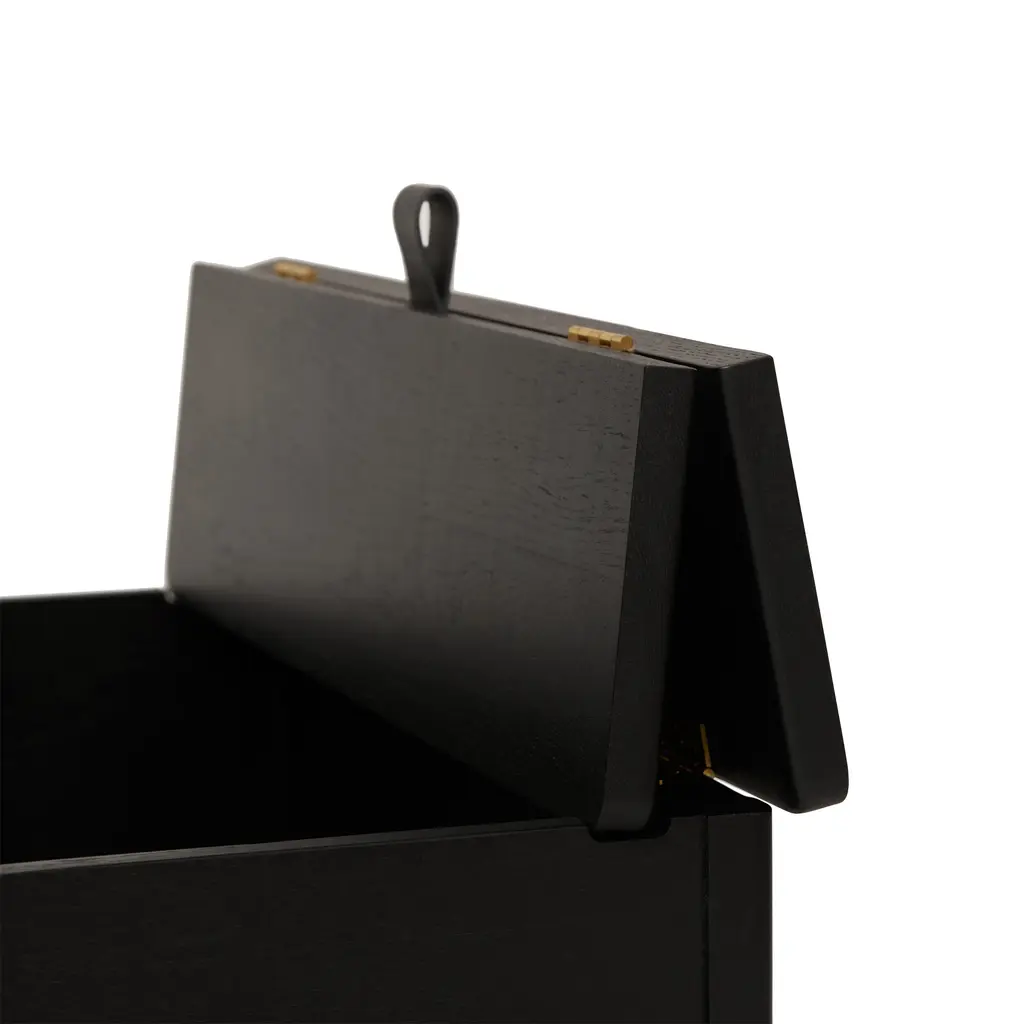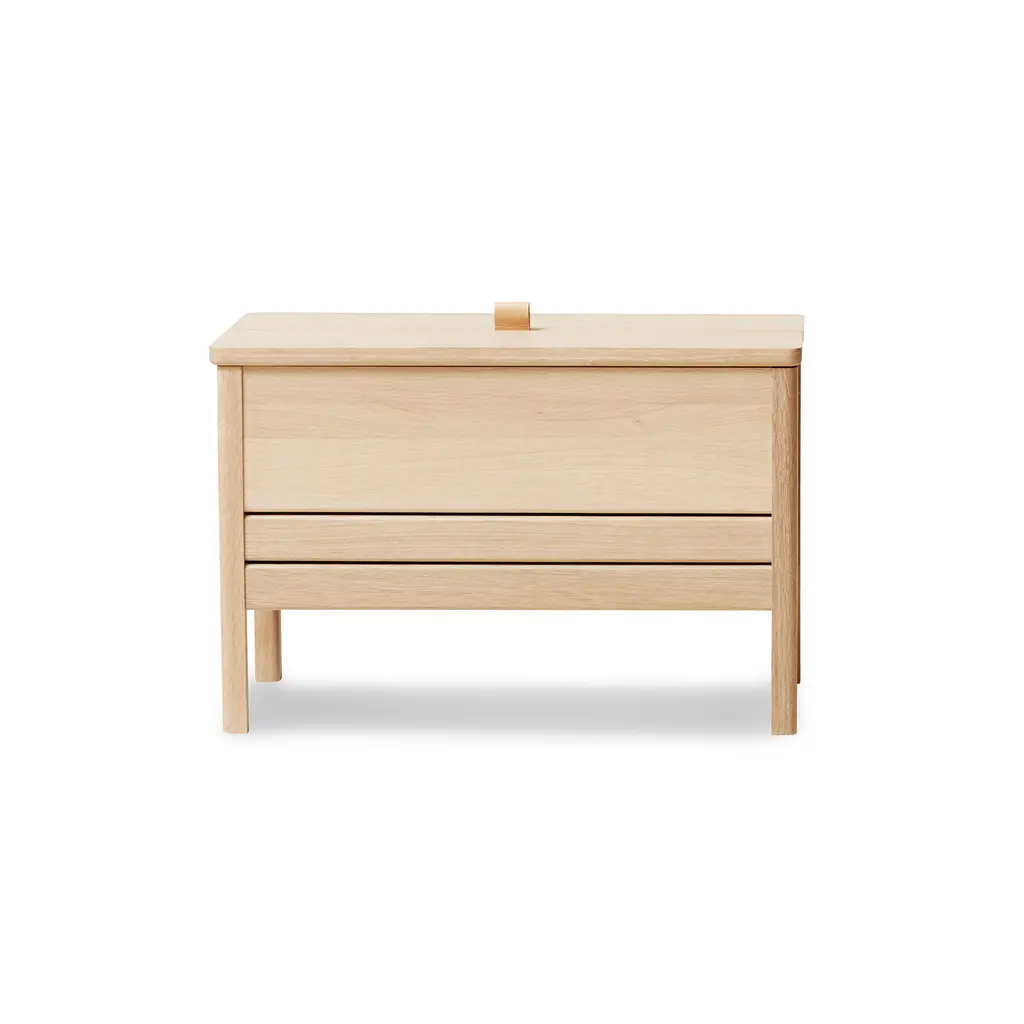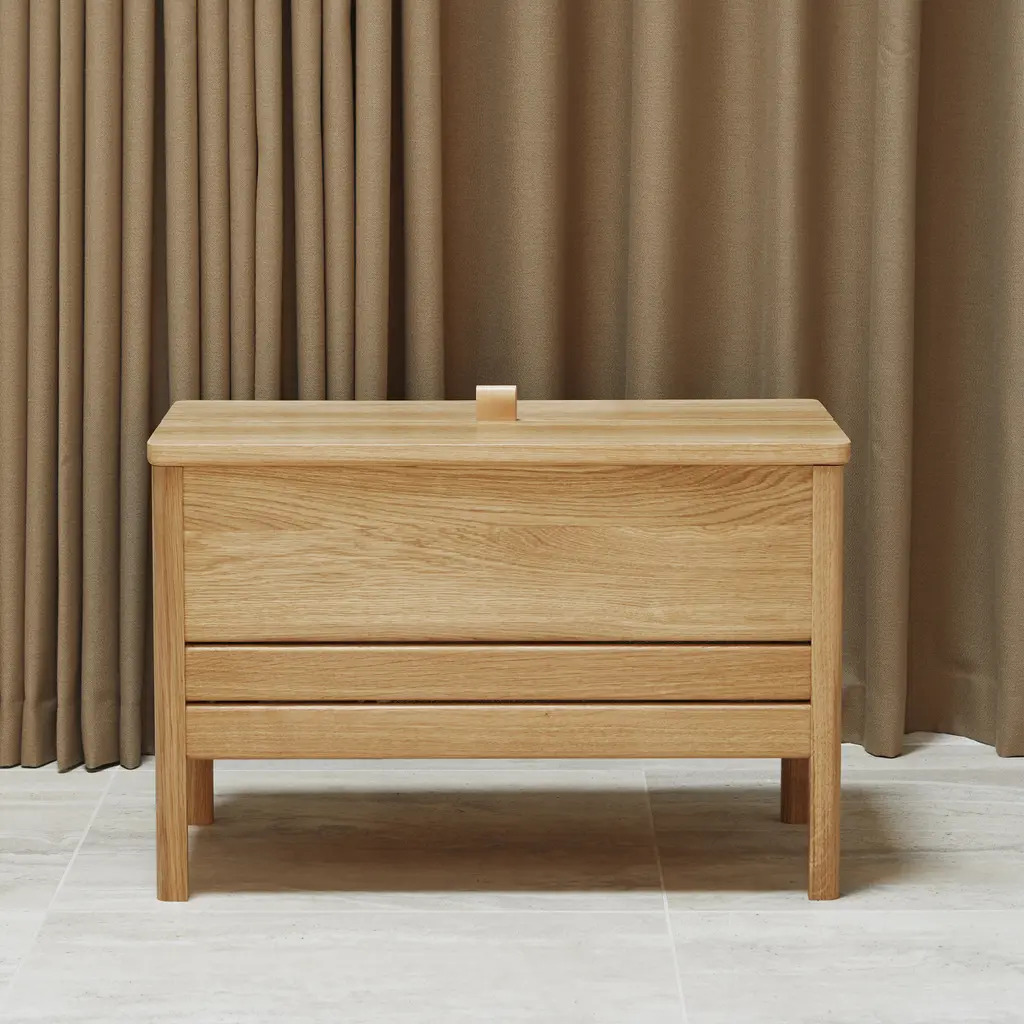 This modern take on the classic stowaway bench beautifully merges practicality with sleek design. Crafted to be both sturdy and adaptable, this bench features a more compact and lightweight structure, yet maintains a minimalist and refined appearance. Its practicality is highlighted by a substantial storage space, divided into two distinct compartments for organized storing. The bench is designed with user convenience in mind. It features a small leather handle for easy lifting of the lid, and the construction is such that the lid remains securely open during use. This thoughtful design element enhances the bench’s functionality while adding a touch of elegance. Available in both natural oak and a sophisticated black-stained oak, this bench offers versatility in its aesthetic appeal, easily fitting into various decor styles. Whether placed in a hallway, bedroom, or living area, this updated stowaway bench is an exemplary fusion of style, utility, and contemporary design.