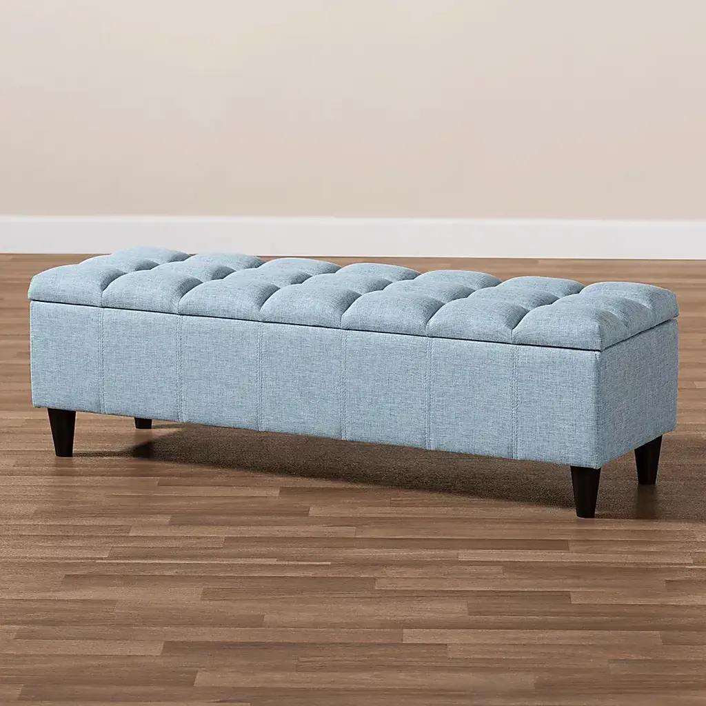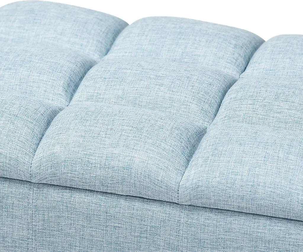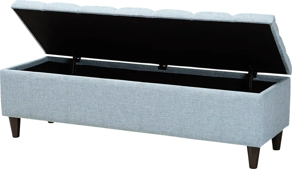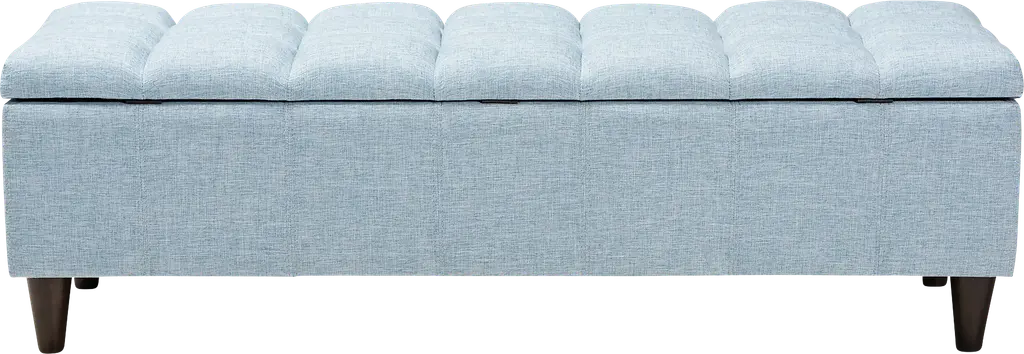 Add style and utility to any space with the Berrycoms light blue storage bench. This chic bench features a streamlined design that makes it easy to coordinate with a wide range of decor styles. Upholstered in soft, durable polyester fabric, the lid is foam-padded and biscuit tufted to provide the utmost sitting comfort. The bench features a storage compartment under the lid, providing space to store extra blankets and pillows. Tapered, dark, brown-finished wood legs add mid-century modern appeal. Use this versatile piece in the entryway, living room, or bedroom. Customer assembly is required.