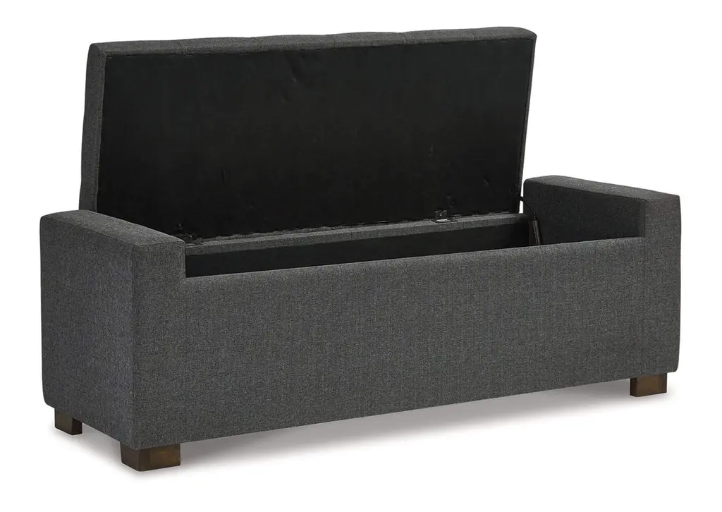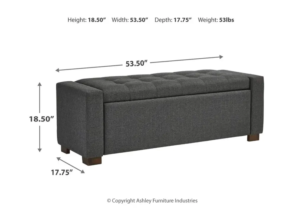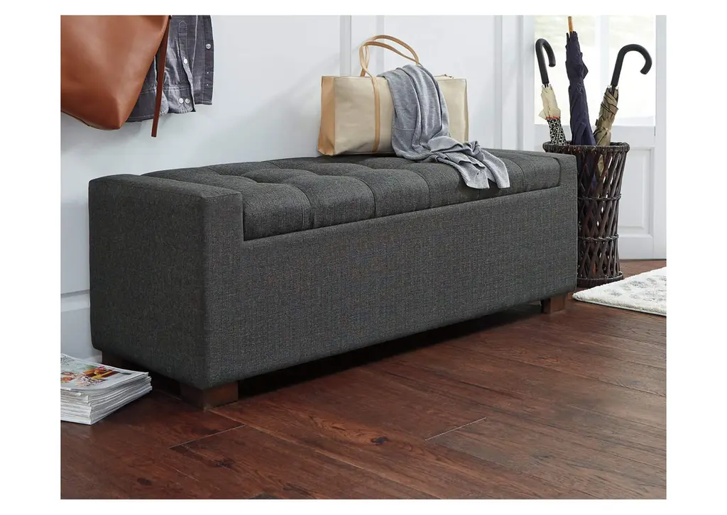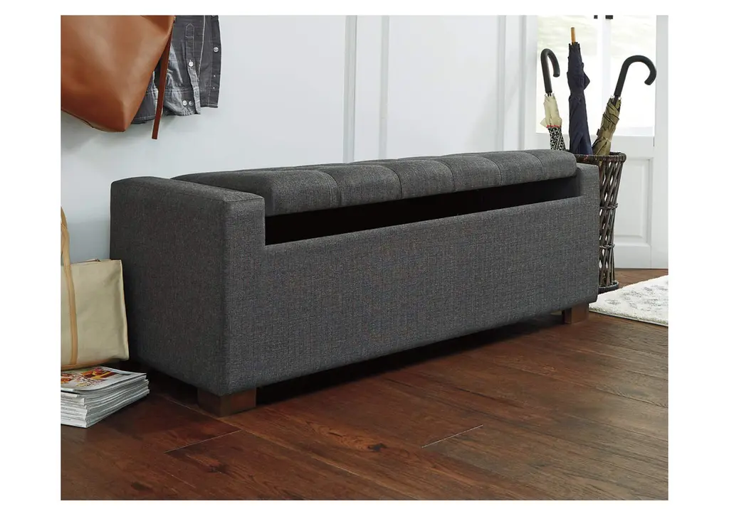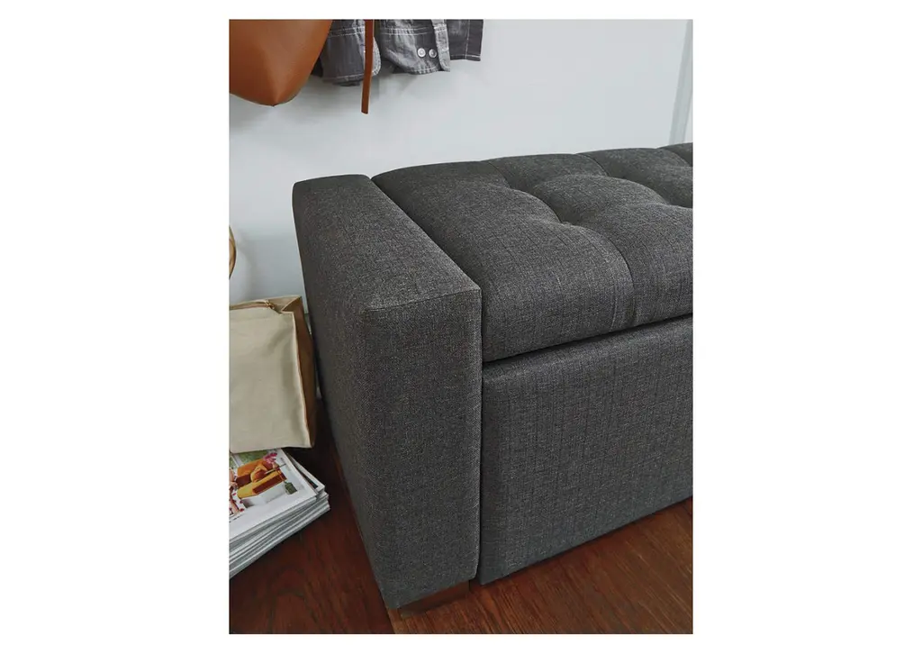 Whether gracing a front entry or living room, or placed at the foot of the bed, the Cortwell upholstered storage bench is loaded with flair. Tufted cushioned seat with hinge reveals an ample storage compartment for this, that and the other. Gorgeous gray fabric is the epitome of neutral sophistication. Weight 54.000 lbs. (24.3kgs.)