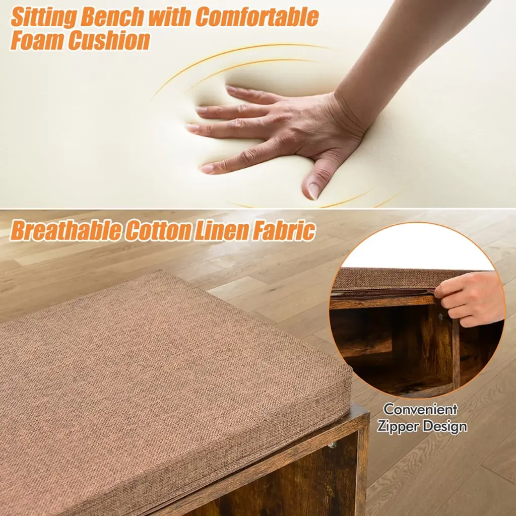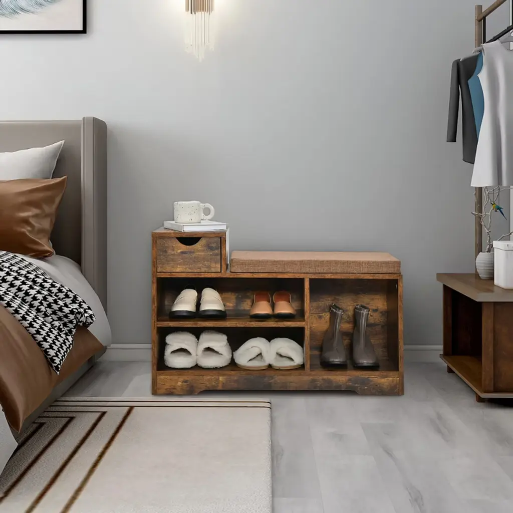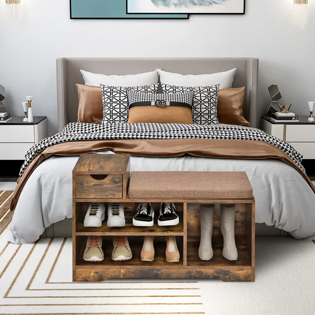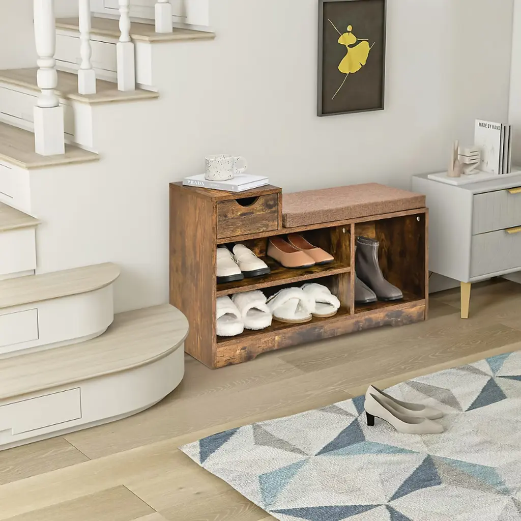 Still woefully jumping on one foot every day in order to change shoes? It's time to buy a shoe bench that has both seating and storage space! Our storage stool and 3 open storage compartments that can accommodate your different sizes of shoes. In addition, it also has an extra small drawer to accommodate your usual keys or change. The cushion of the bench is made of breathable cotton and linen material, while the interior is filled with high quality foam. Whether for the living room, bedroom or entryway, it is a piece of furniture that is both practical and beautiful.FeaturesHigh quality engineered wood has good bending resistance and strength Bench can hold up to 330 pounds, so both children and adults can sit on it Shoe bench with3 storage compartments to accommodate your different size shoes An extra small drawer on top of the bench for frequently used items The top cushion is attached to the seat and can be removed at any time Highly quality foam and breathable cotton linen surface provide a comfortable sitting experience The 2-layer storage bench has a classic shape and is suitable for all styles of decoration Detailed instruction is included for quick installationColor: Rustic Brown Material: Engineered wood, Foam Product Dimensions: 32'' x 12'' x 21'' (L x W x H) Load Capacity for Seat: 330 lbs Load Capacity for Each Shelf: 33 lbs Load Capacity for Drawer: 11 lbs Net Wight: 31 lbs Package Includes: 1 x Shoe Bench 1 x Instruction