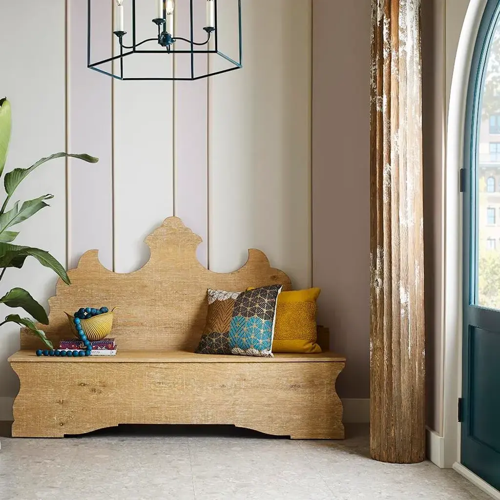 A distinctive storage bench styled in the fashion of an Italian Baroque cassone (marriage chest) from the 18th century. A high patterned wood back resides above a wood seat that lifts to expose a storage compartment.