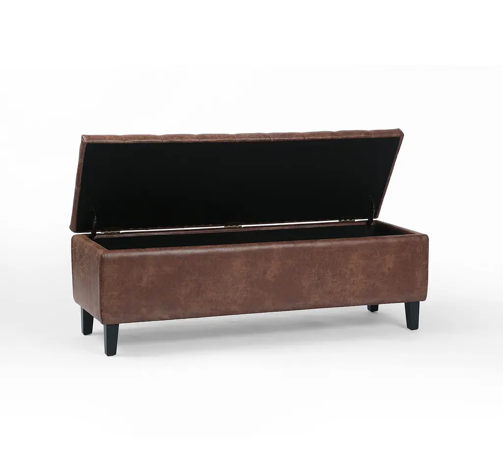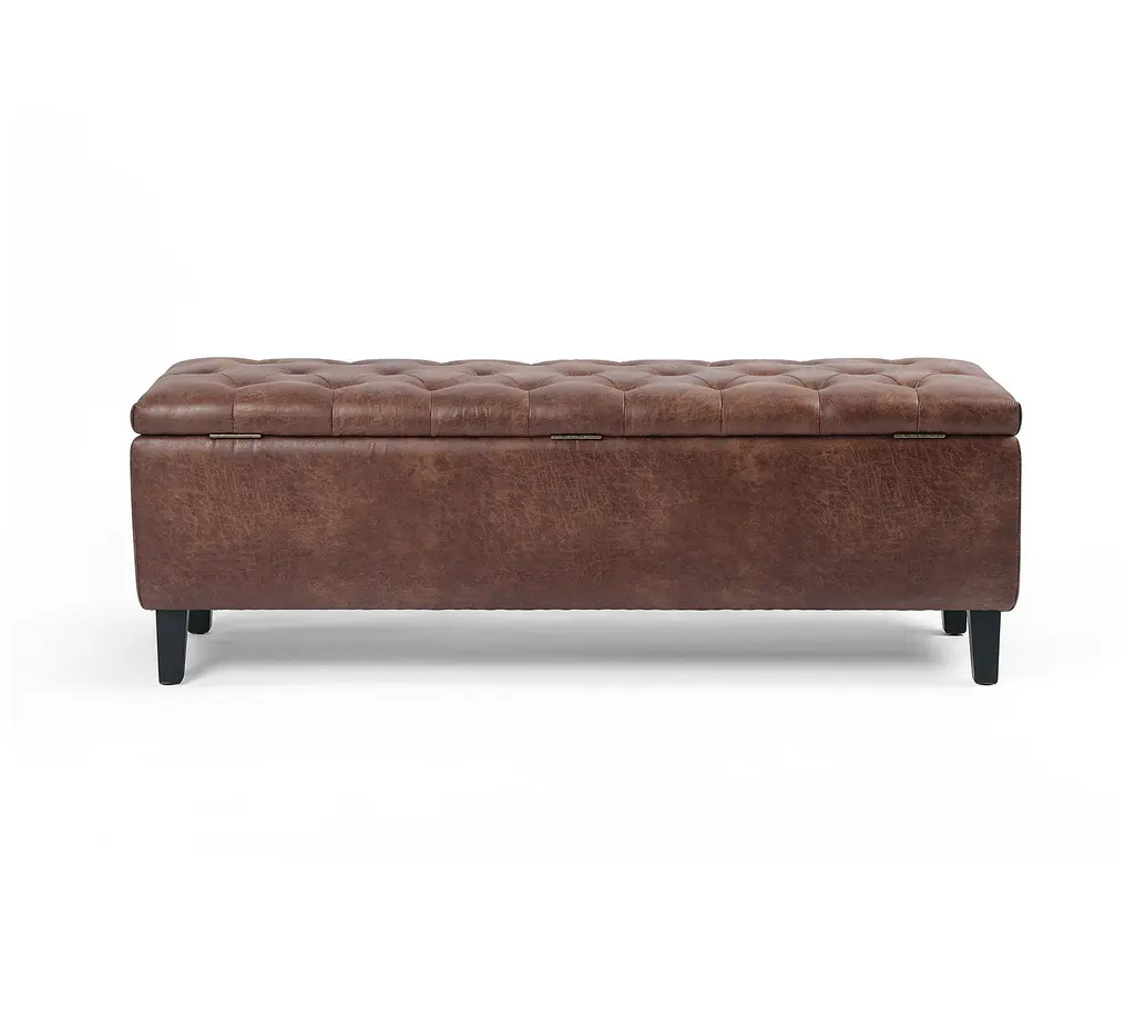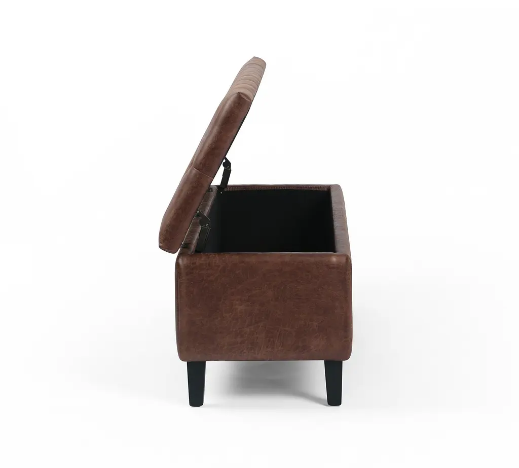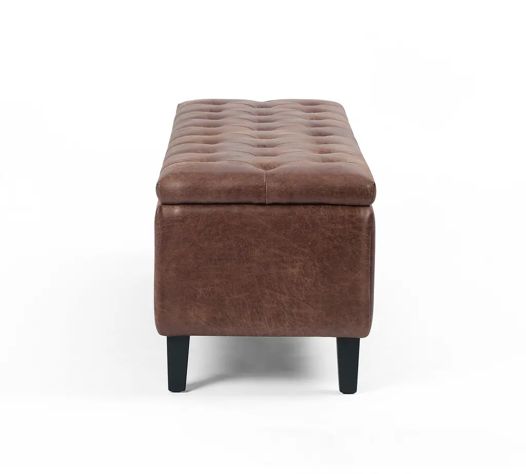 Complete the room and add a little extra space to store the essentials with our Jay Tufted Storage Bench. Featuring tufting of perfectly-worn faux-leather, this bench can hold extra blankets, pillows or seasonal decor – the perfect space-saver.