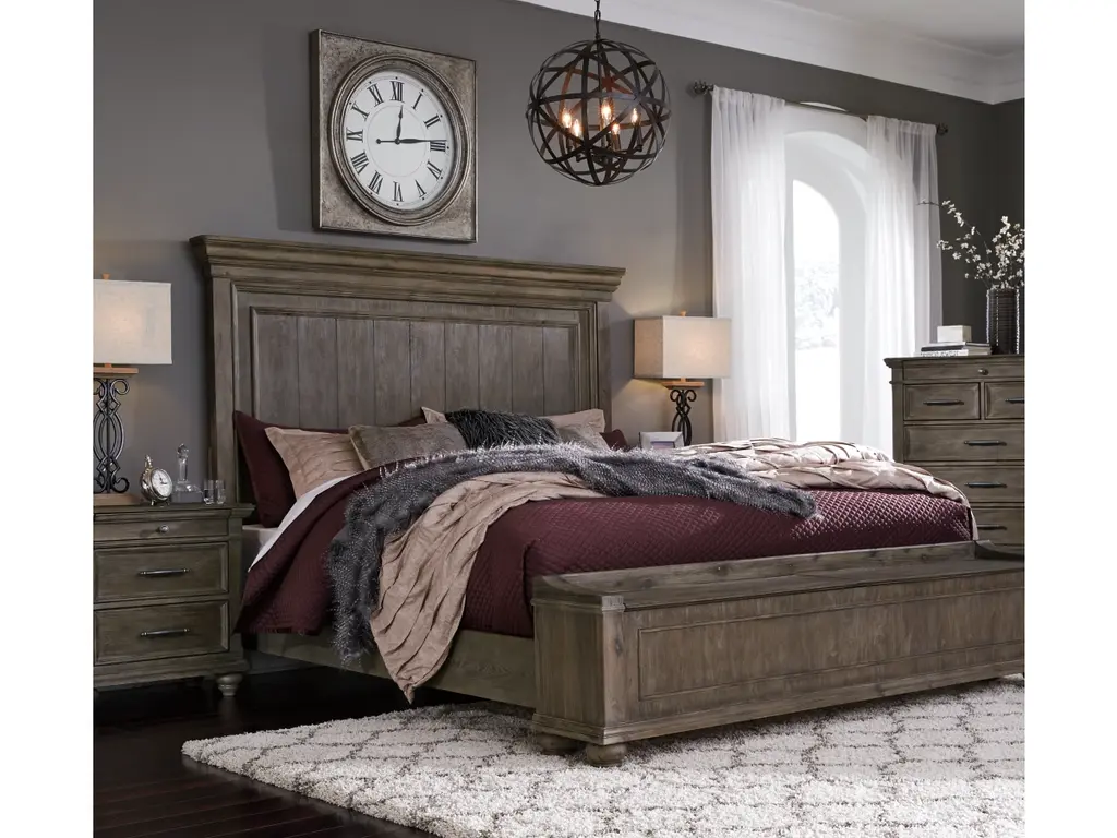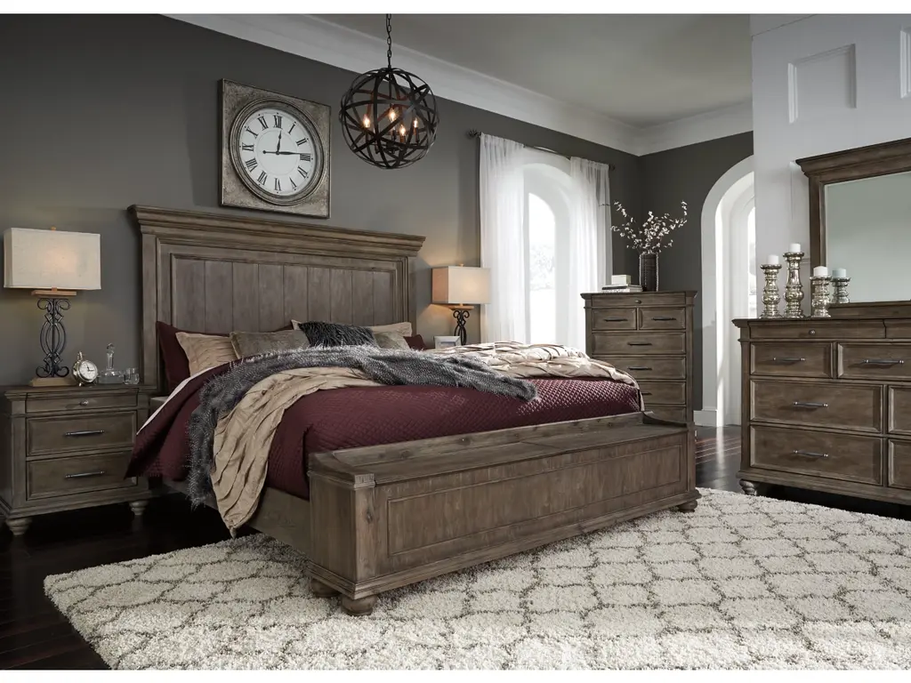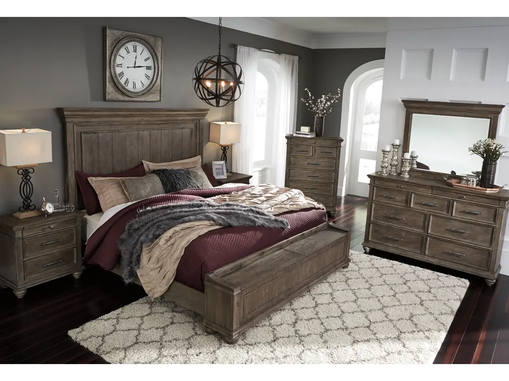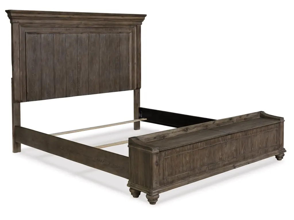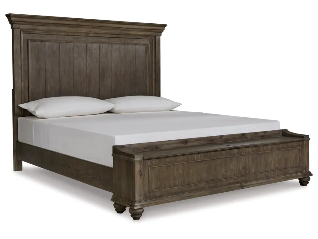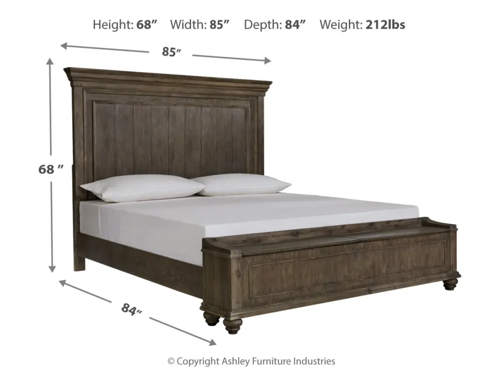 Homey. Hearty. Heavenly hued. Luring with a distressed weathered gray finish, substantial mouldings and a tall mansion-style headboard with great presence, the Johnelle king bed with storage is sure to make your homestead feel that much more like home. The look is beautified with elm veneers for a richly crafted master suite masterpiece made for years of satisfaction. Hinge-top storage bench at the foot of the bed is loaded with charm and purpose. Whether your aesthetic is classic, eclectic or modern farmhouse, rest assured, this high-style, high-quality king storage bed is an inspired choice. Mattress and foundation/box spring available, sold separately.