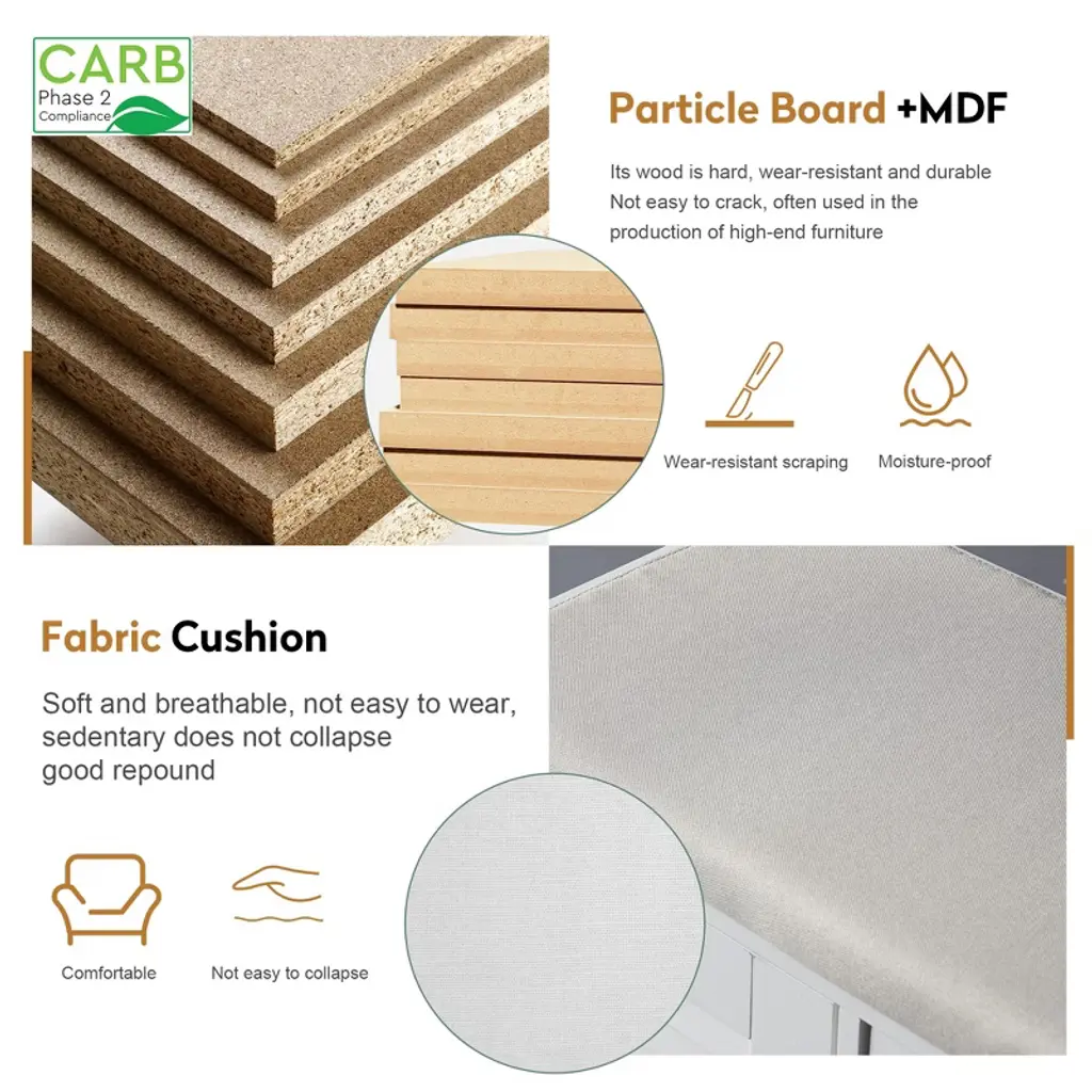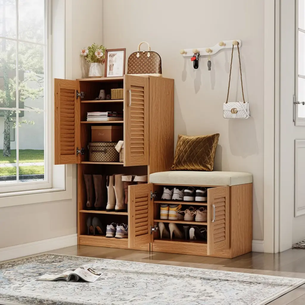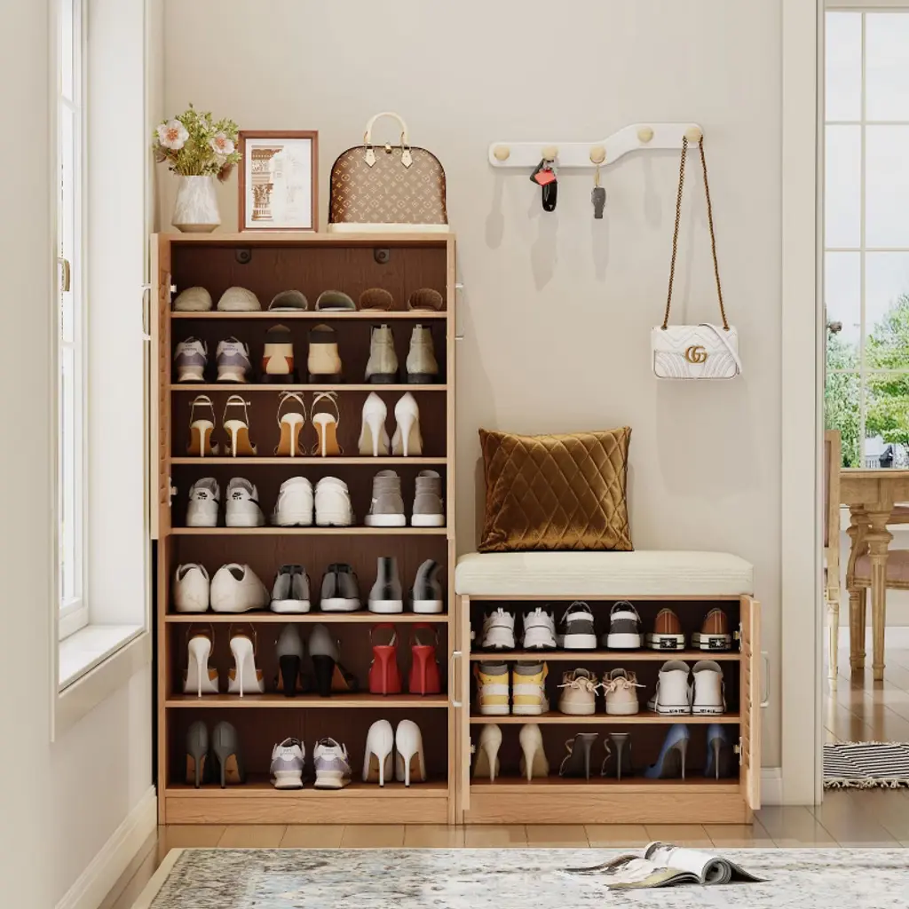 The KTMBDW entryway bench can hold up to 30 pairs of shoes with a deeper storage design for larger shoes. It also has adjustable shelf for boots and high heels and additional storage space underneath the shelfs for a neat and organized entryway.