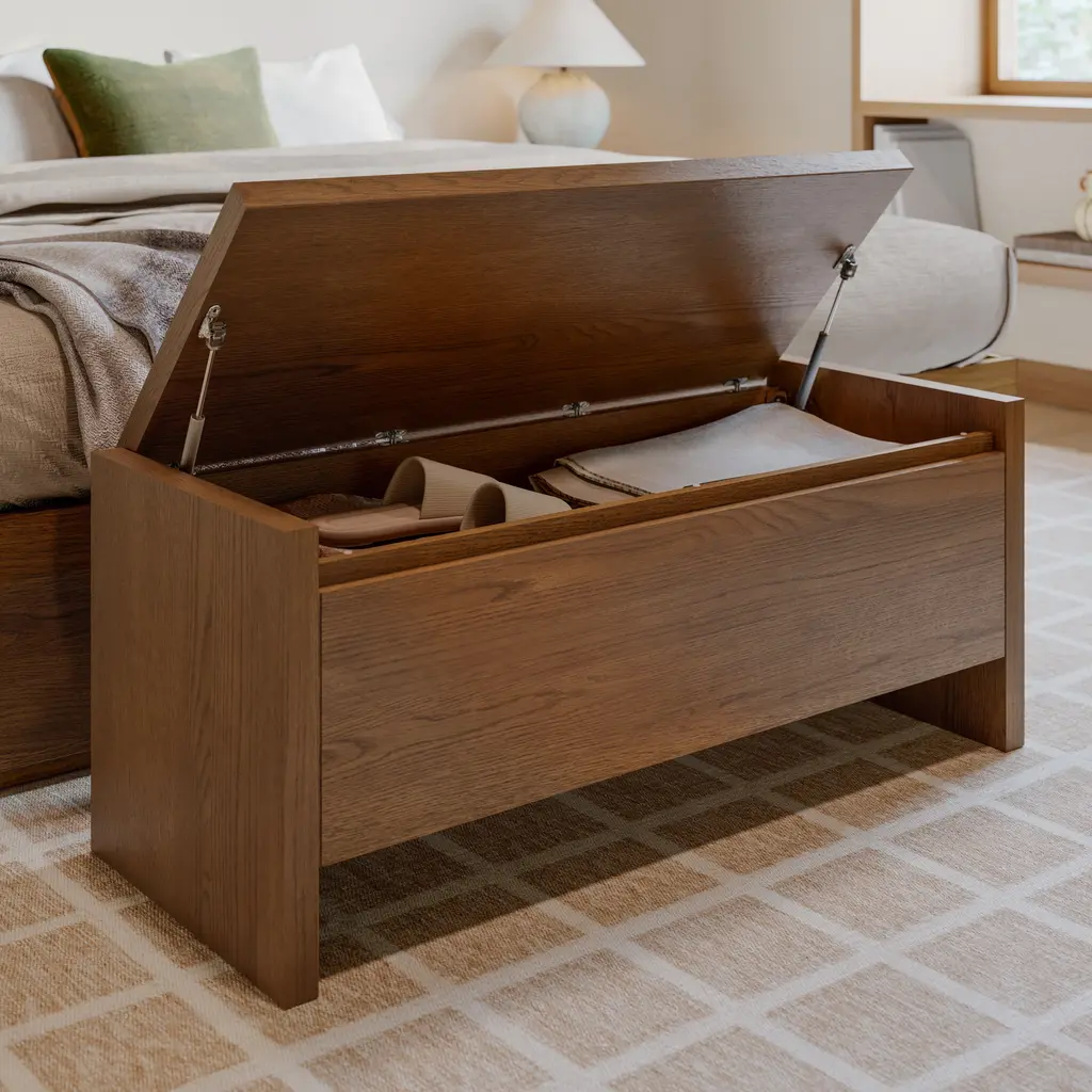 The strong, silent type. The Leif bench embodies the classic tropes we associate with Scandinavia: good-looking, sturdy, impeccable posture. With a hydraulic-assist-lift mechanism to access its spacious storage space, you can rest assured that your Leif not only looks gorgeous, but it's also soft-spoken and sensitive to your (storage) needs.