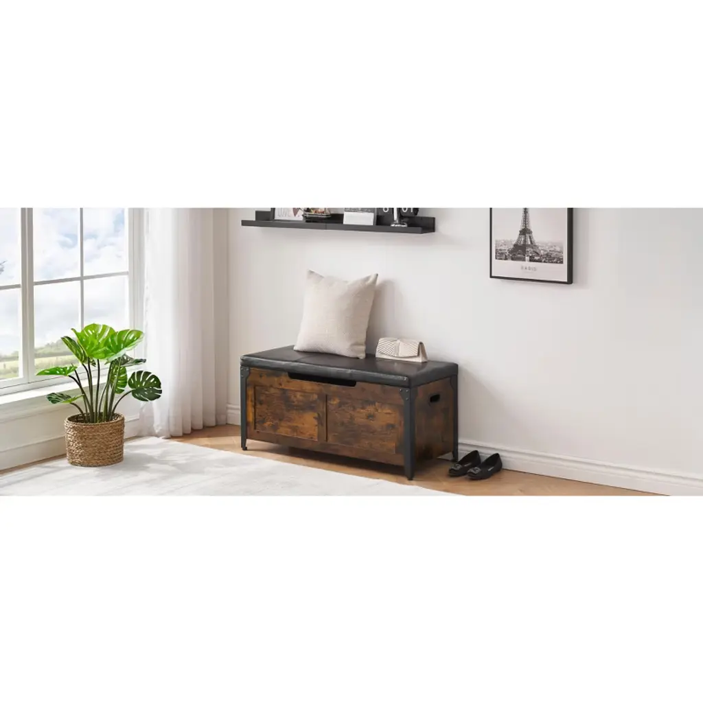 Maximize your entryway organization with this sturdy storage bench featuring a smooth-lifting top and dual safety hinges for secure access. The spacious interior offers hidden storage for shoes, bags, or seasonal items, while the weighted base ensures stability. Upholstered in easy-clean fabric, the cushioned top doubles as extra seating. Perfect for mudrooms, bedrooms, or living rooms.