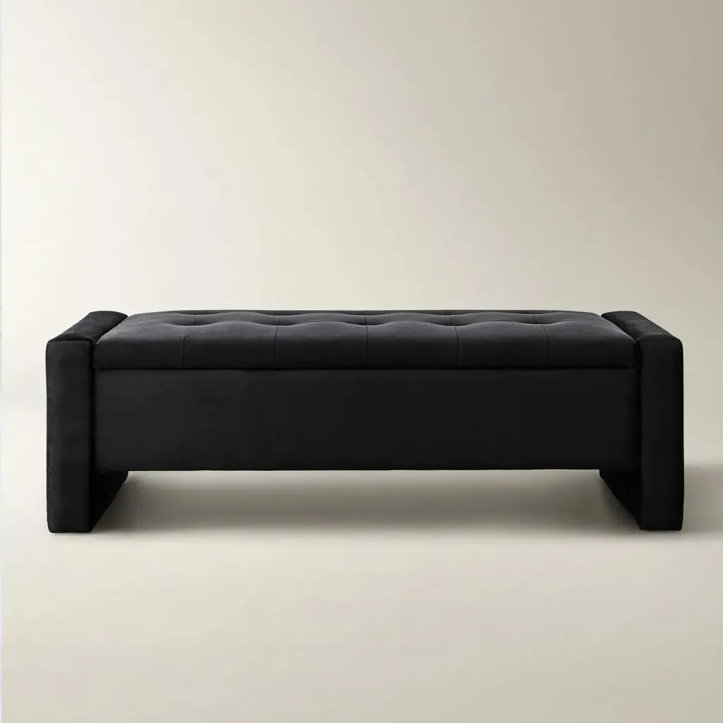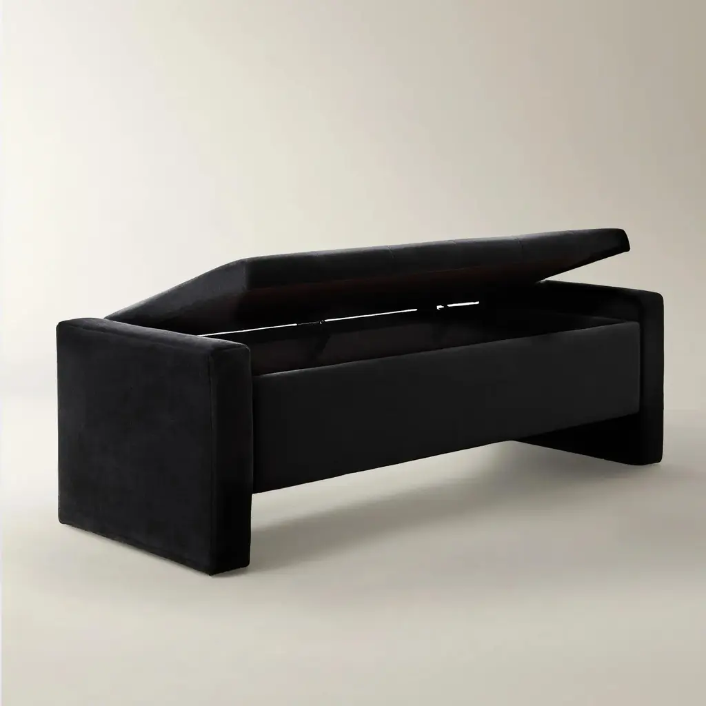 A stylish addition to the entryway or at the foot of the bed, this bench is framed in sturdy kiln-dried hardwood with a modern silhouette and amply padded cushion that lifts up to reveal convenient storage. Shown in Bella Velvet Black.Z Gallerie exclusiveCustom Orders: Custom Furniture is manufactured especially for you, which is why we do not accept cancellations, exchanges, or returns.