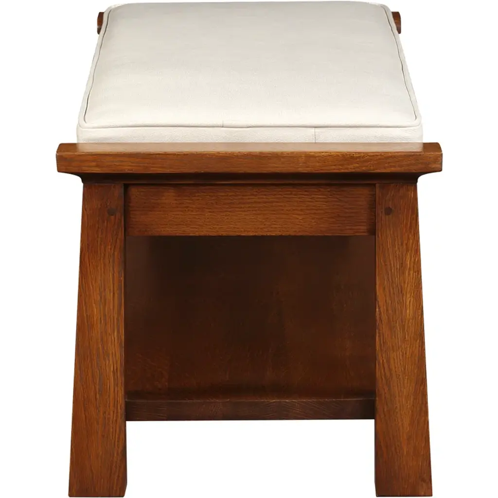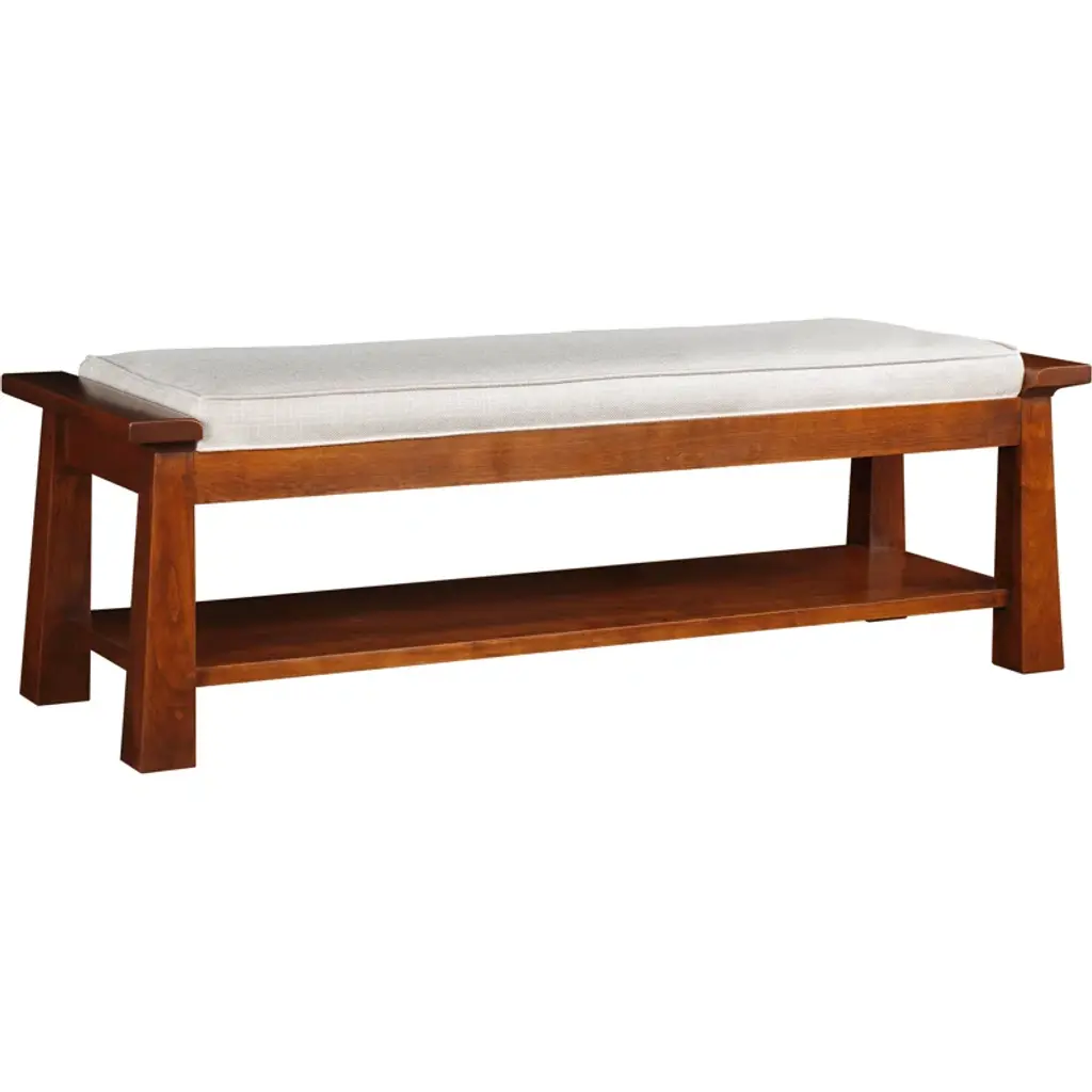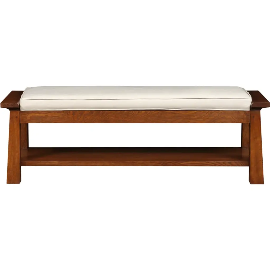 Tapered posts with sculptural cap rails become the framework to nest a tailored seat cushion. An expansive shelf below offers space for storage.