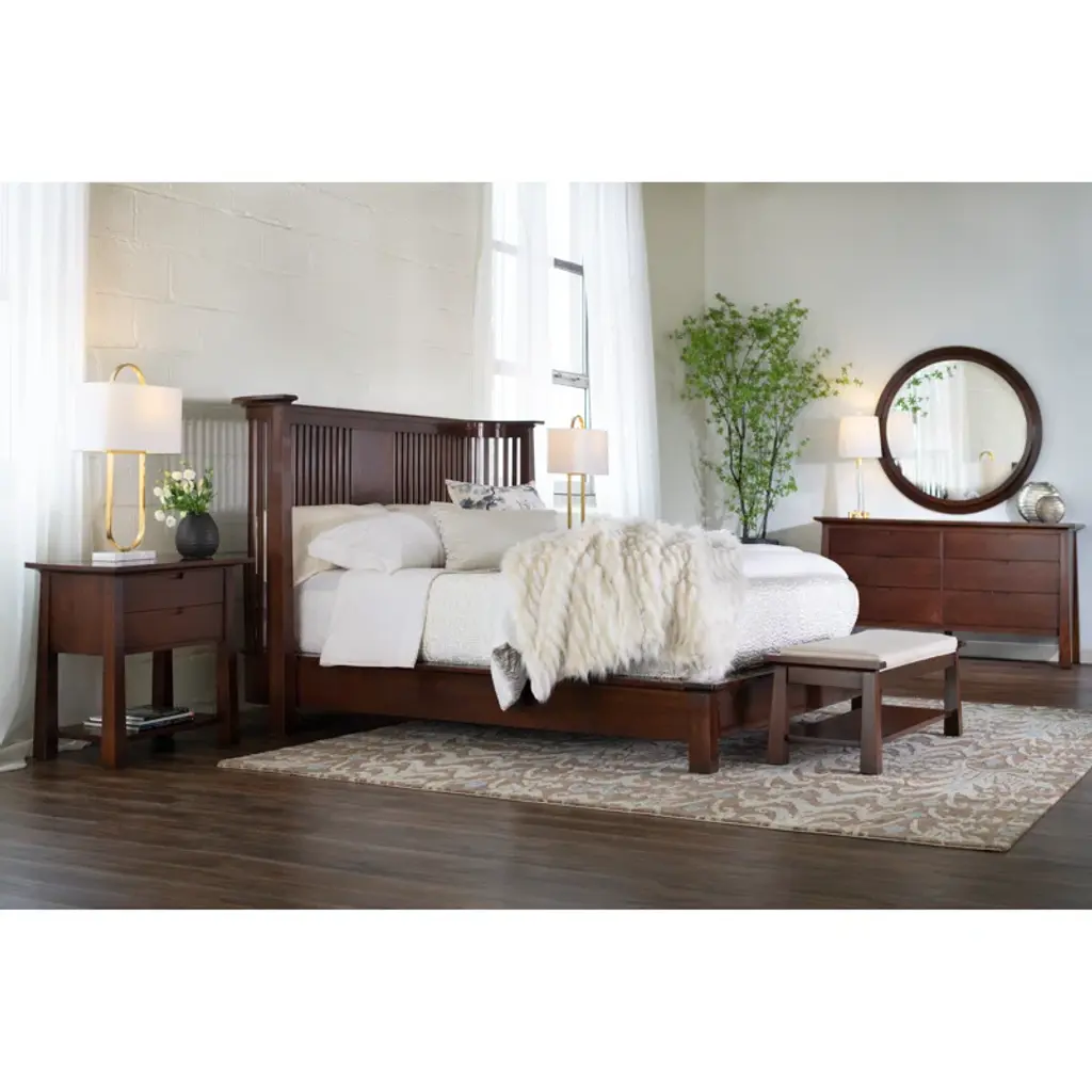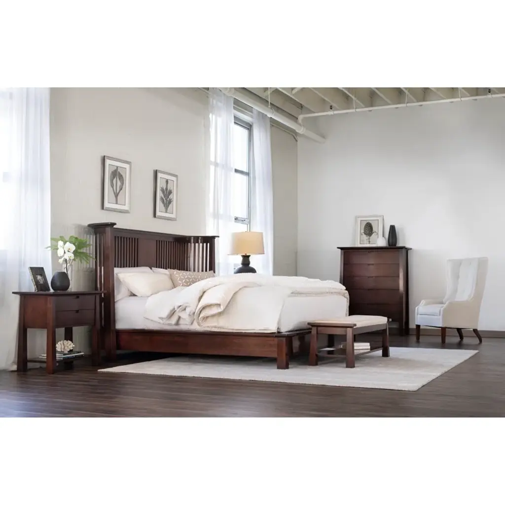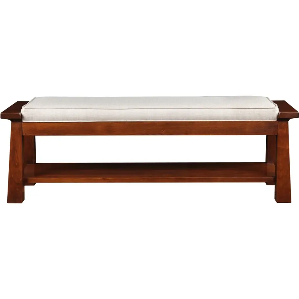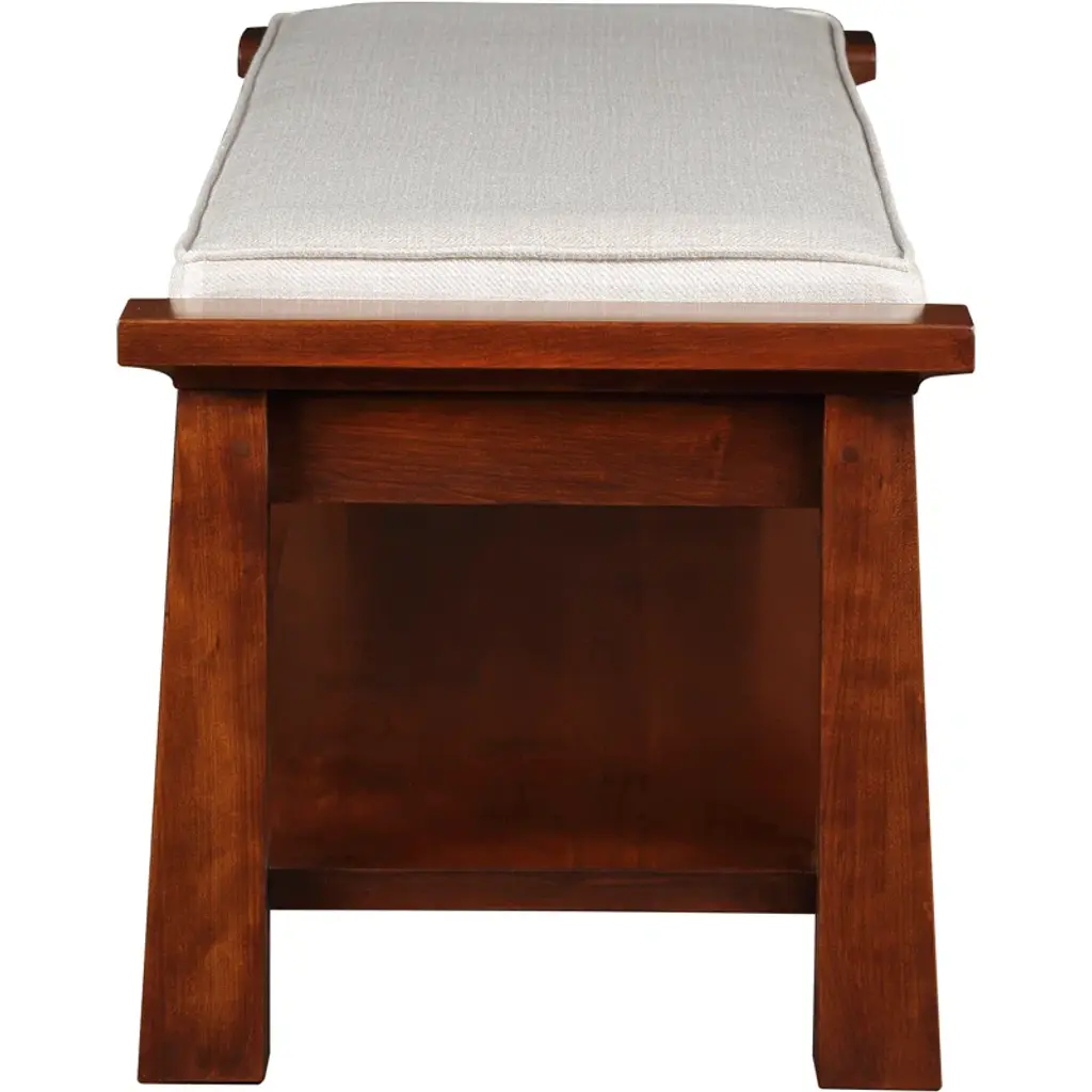 Tapered posts with sculptural cap rails become the framework to nest a tailored seat cushion. An expansive shelf below offers space for storage.