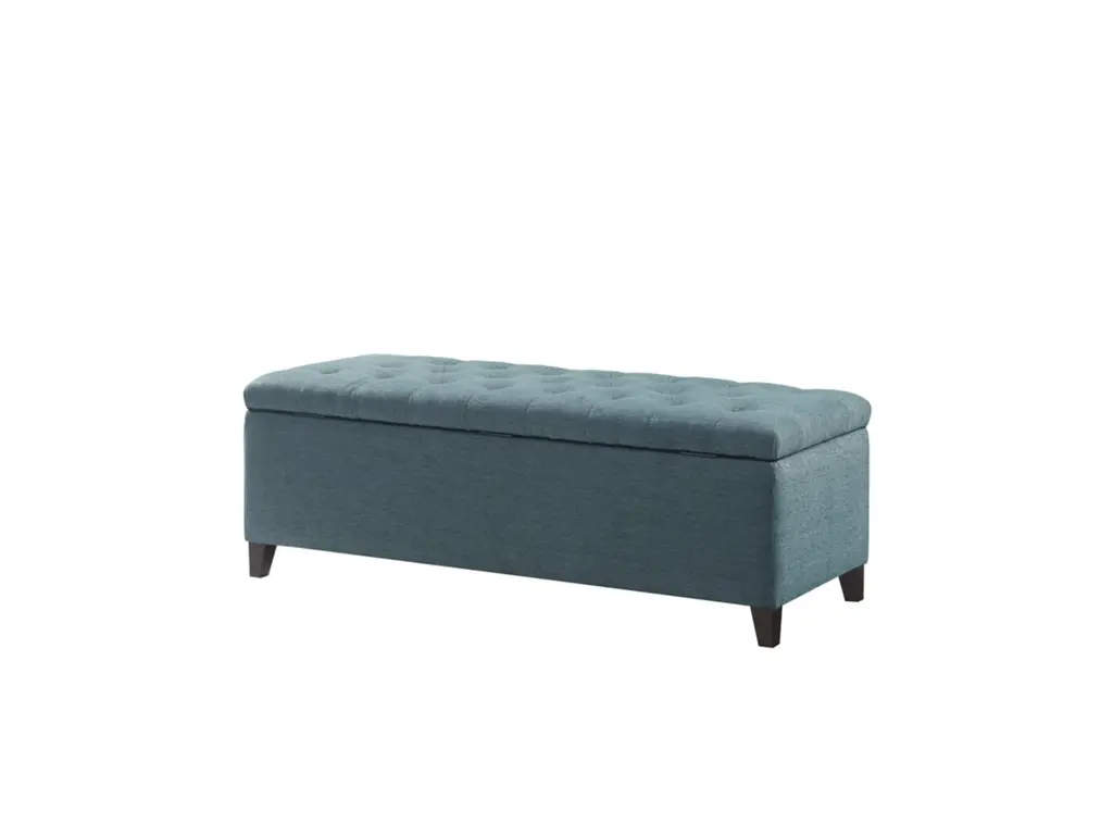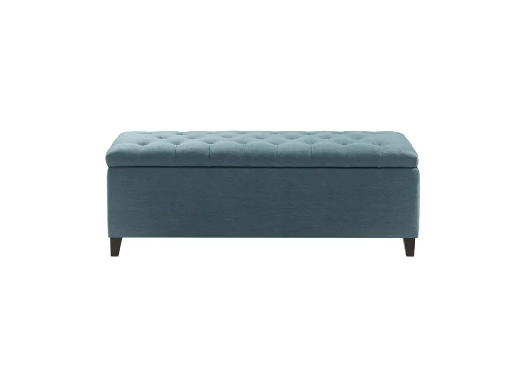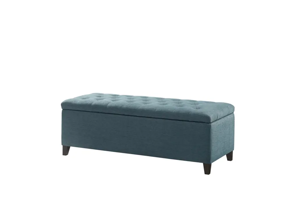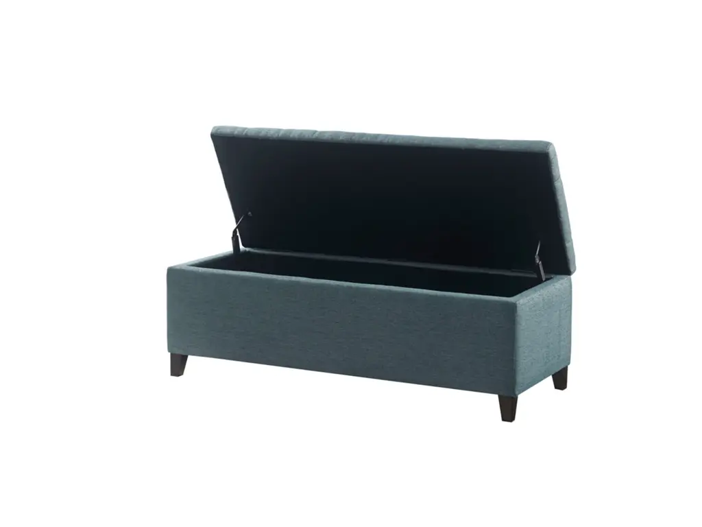 This modern storage ottoman accentuated with button tufting provides ample storage and features an elegant peacock blue fabric with rich espresso legs. No assembly required