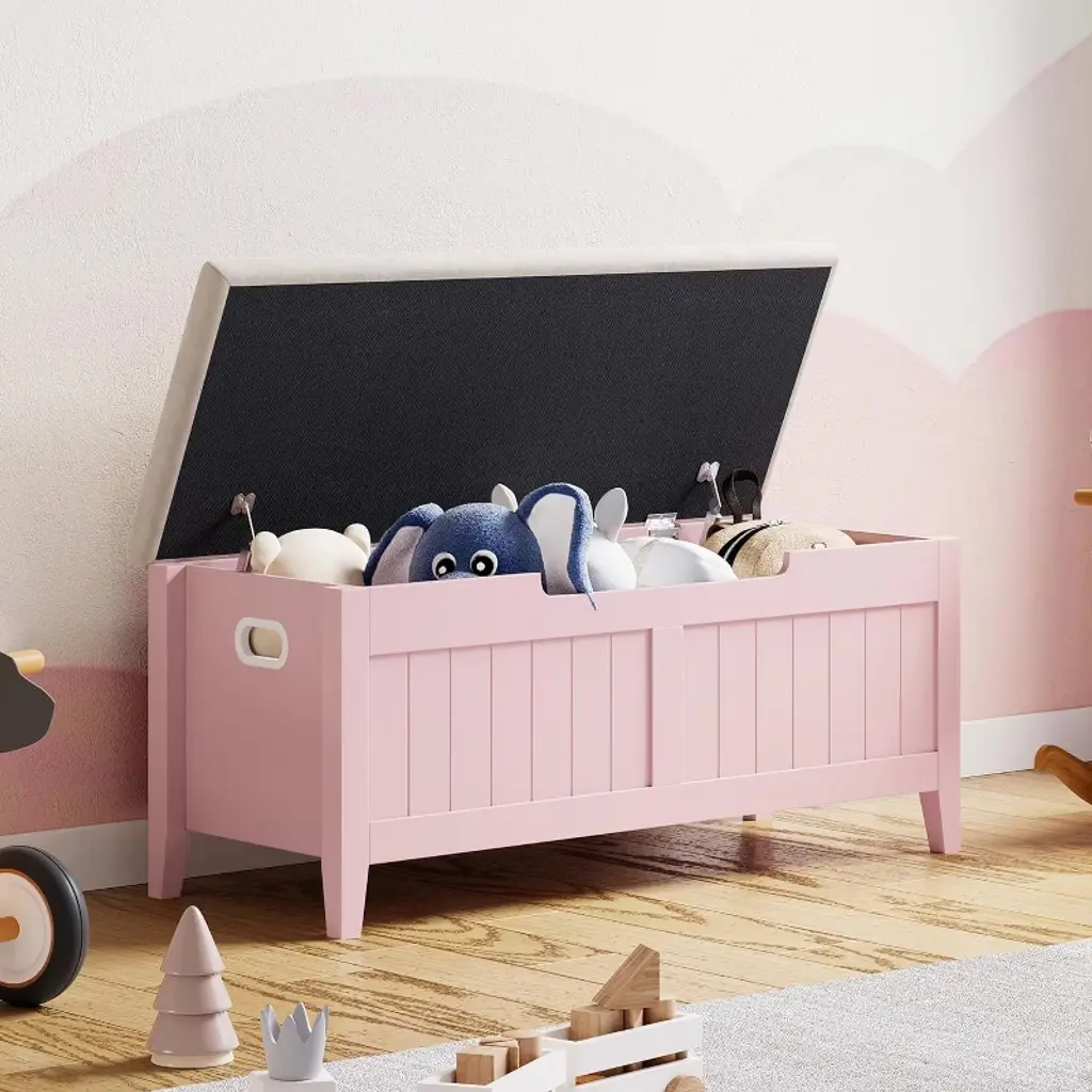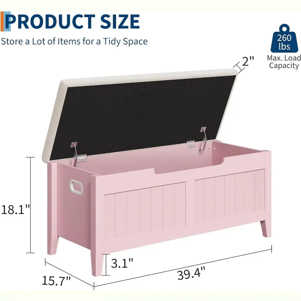 Spacious Storage Compartment: The extra large capacity stow away your bulky winter quilts, piles of seasonal clothing or bedding, stacks of books, or various household sundries. Away from the hassles of daily storage. keep your living environment neat, organized, and clutter-free. Dimension: (39.4"L x 15.7"W x 18.9"H) Enhanced Safety Hinges: Features 2 built-in safety hinges to prevent the lid from slamming shut, protecting fingers. The convenient front cut-out allows for easy one-handed opening Durable Build: Engineered for strength with high-quality particle board and reinforced 15mm thick walls, supporting up to 260 lbs. The soft padded top adds comfortable seating and elegant style Ergonomic Side Handles: Wide, comfortable cut-out side handles make it effortless to relocate this versatile bench wherever you need extra storage or seating – bedrooms, entryways, or living rooms Easy Assembly: The box comes with all the necessary parts and a clear illustrated guide. Assembly is quick and straightforward, allowing you to enjoy your new storage solution with home style