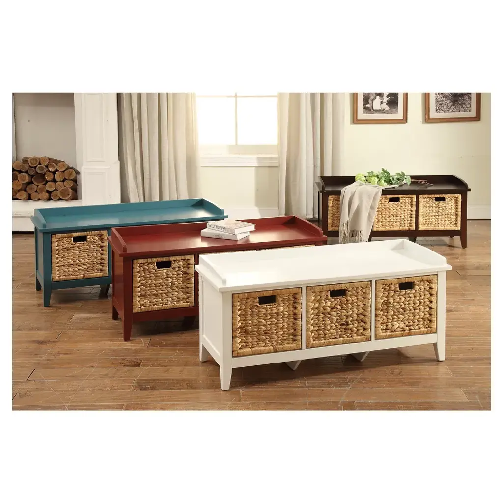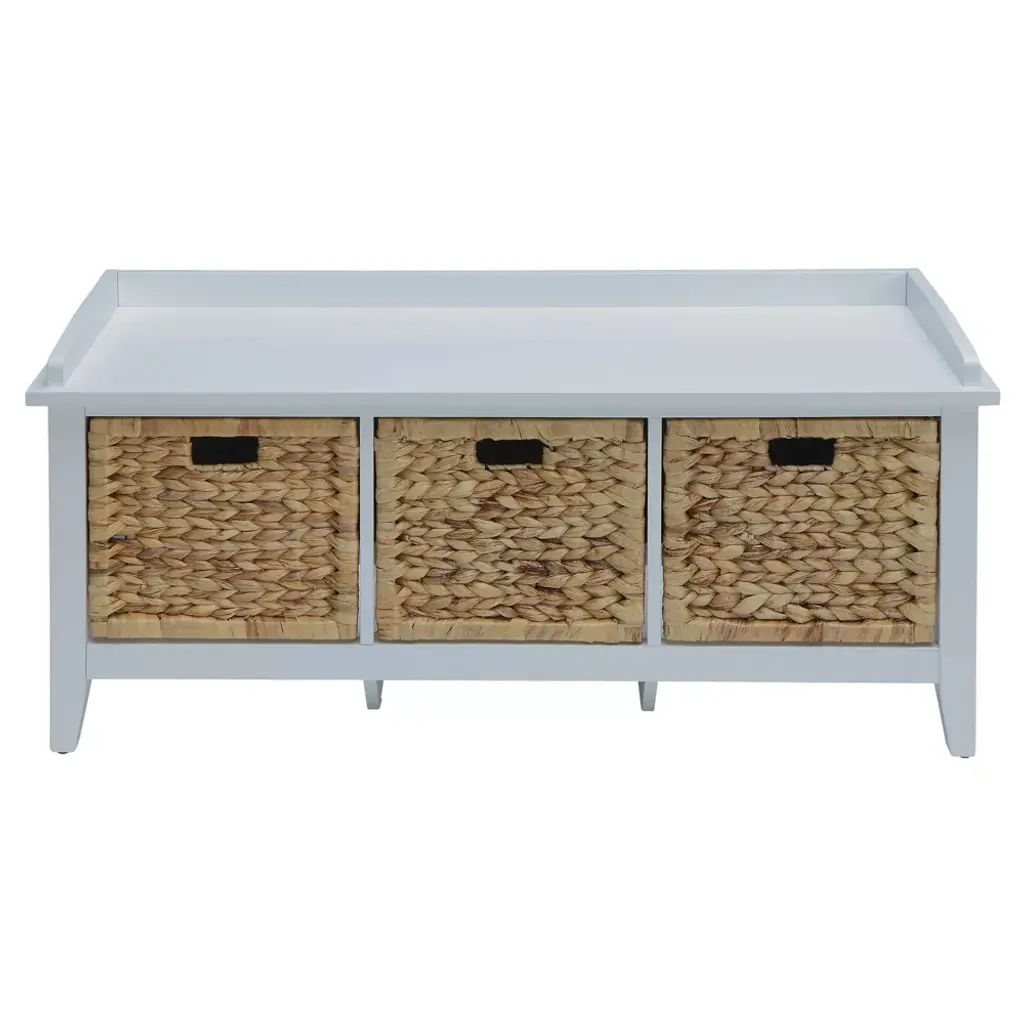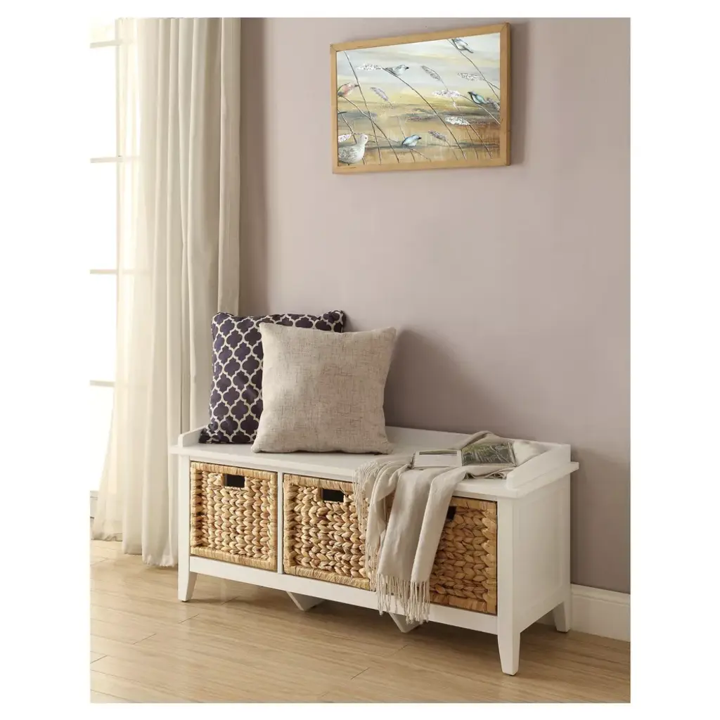 Update your entryway with the functional White Storage Bench from Acme Furniture. Three cubbies sit under the bench seat, with woven storage baskets keeping everything neatly tucked away. Keep the bench as is or add some comfort and personalization with a cushion along the seat. The sturdy wood construction supports up to 250 pounds, letting you sit and put on or take off your shoes as you leave or get home after a long day.