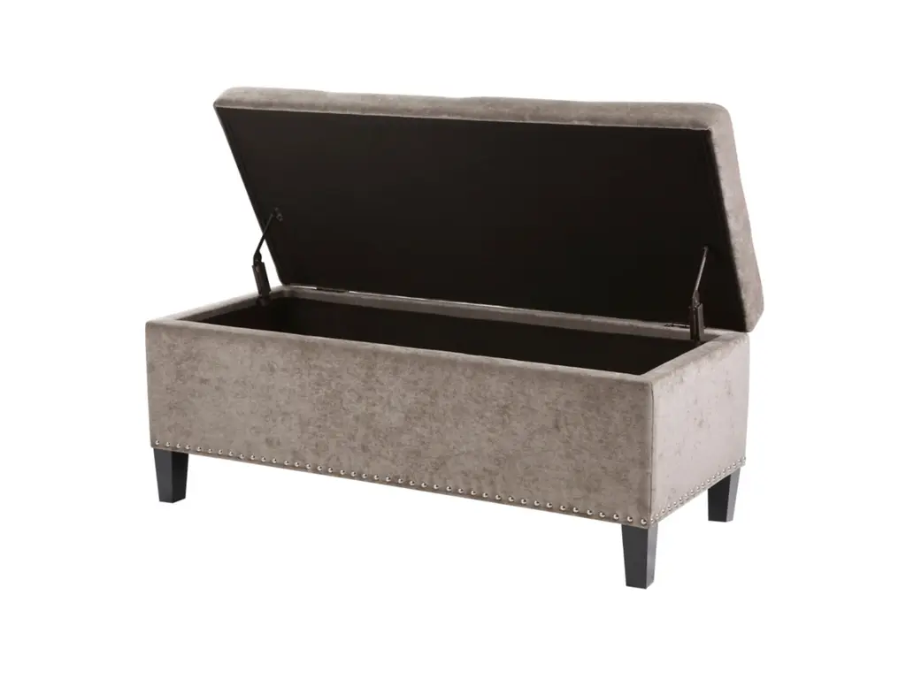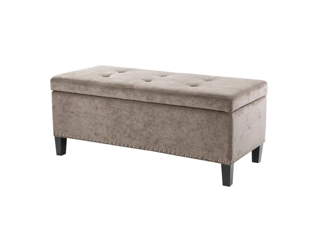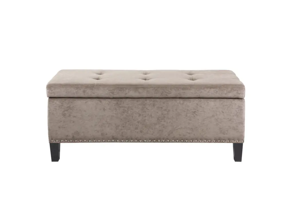 This modern storage bench accentuated with button tufting provides ample storage and features an elegant gray colored soft fabric with black noir legs. Assembly Required.